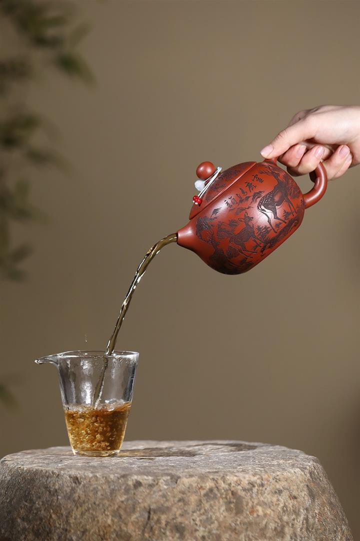 【泥料特點】砂土氣重,似淳實農民,日久使用,漸露鋒芒,養成變化,溫潤莊重。紫砂是壹種雙重氣孔結構的多孔性材質,氣孔微細,密度高。用紫砂壺沏茶,不失原味,且香不渙散,得茶之真香真味。紫砂使用越久,壺身色澤越發光亮照人,氣韻溫雅。紫砂壺長久使用器身會因撫摸擦拭,變得越發溫潤光澤。