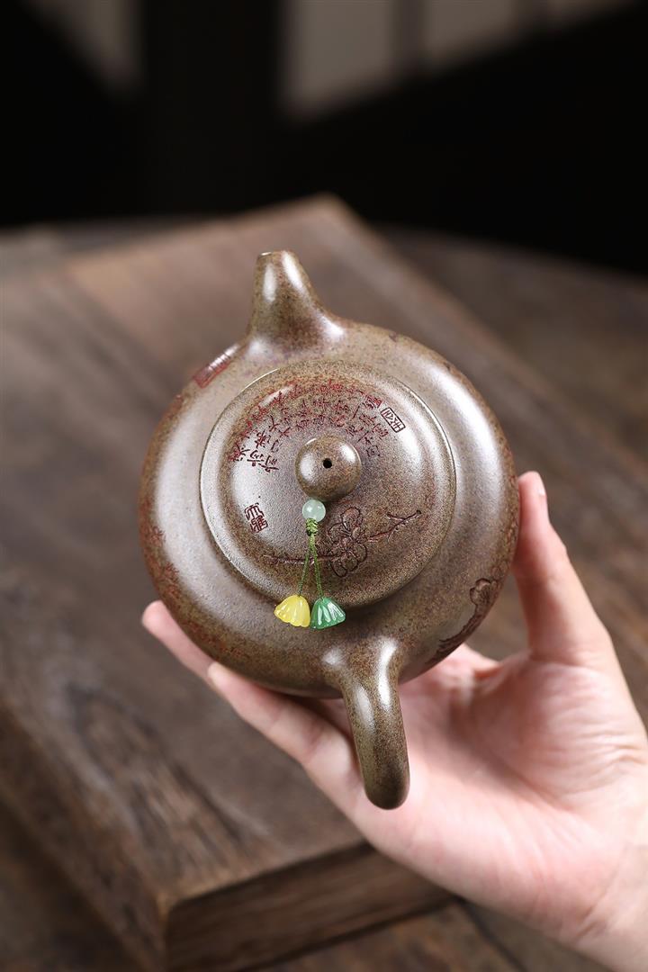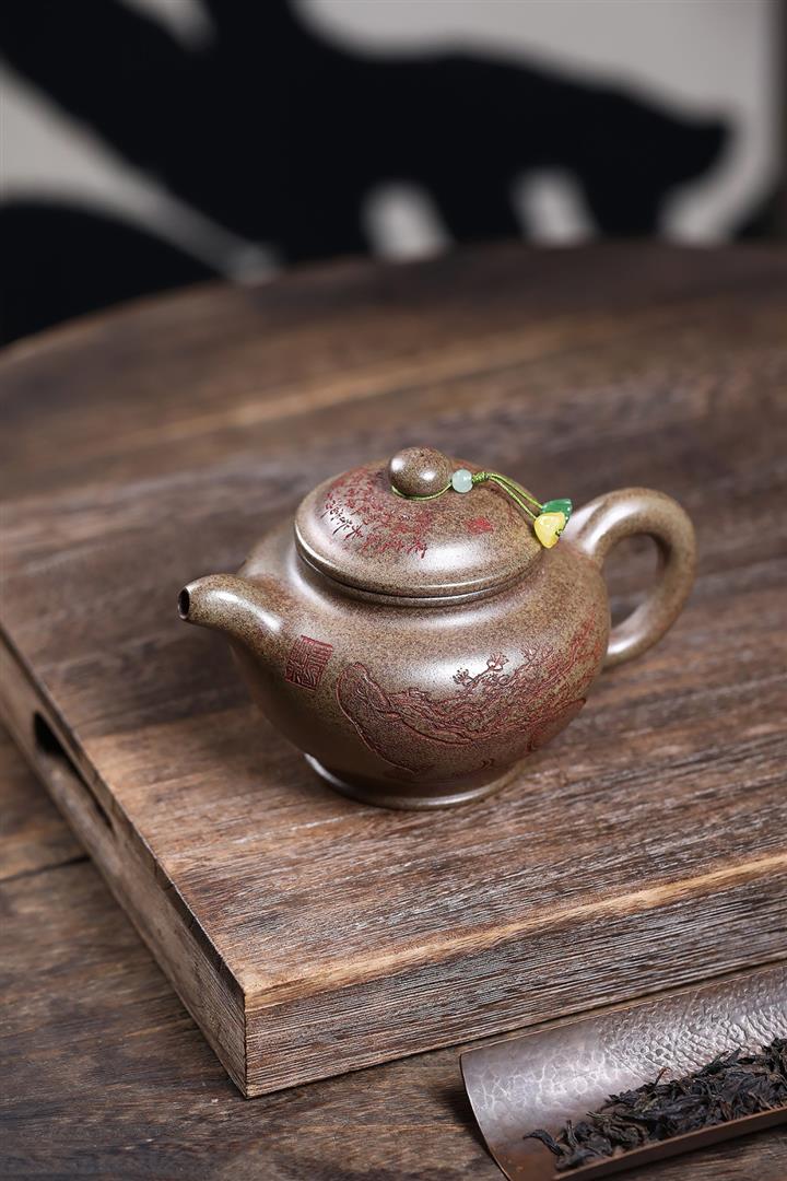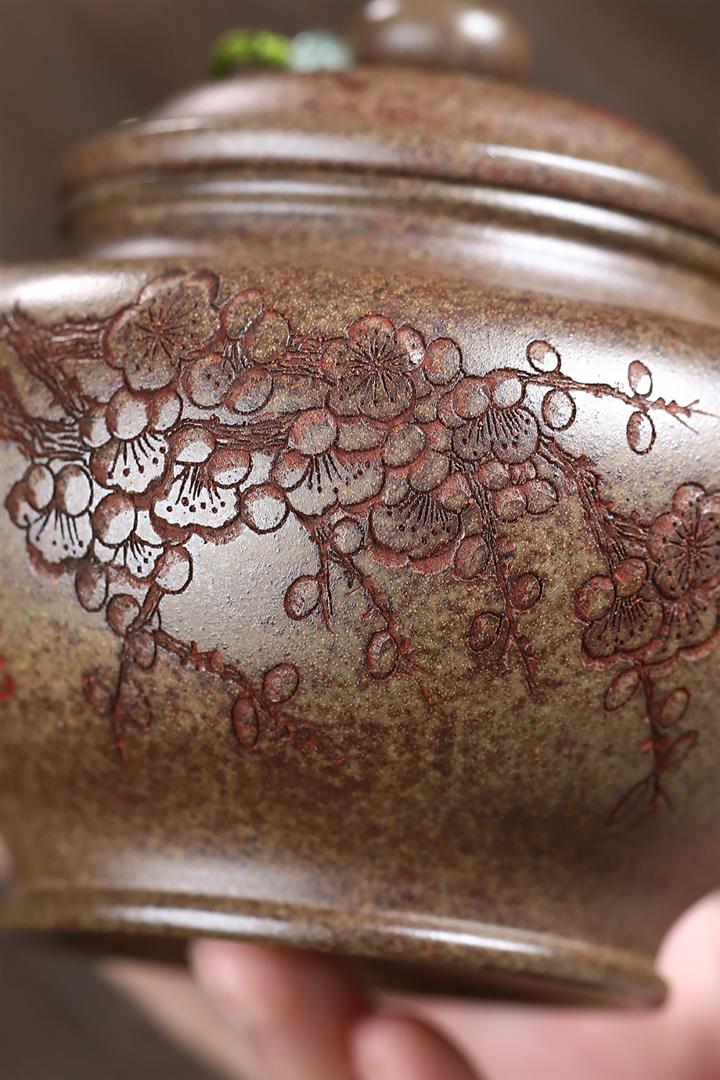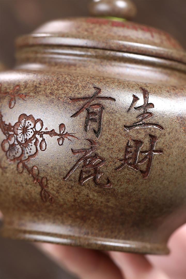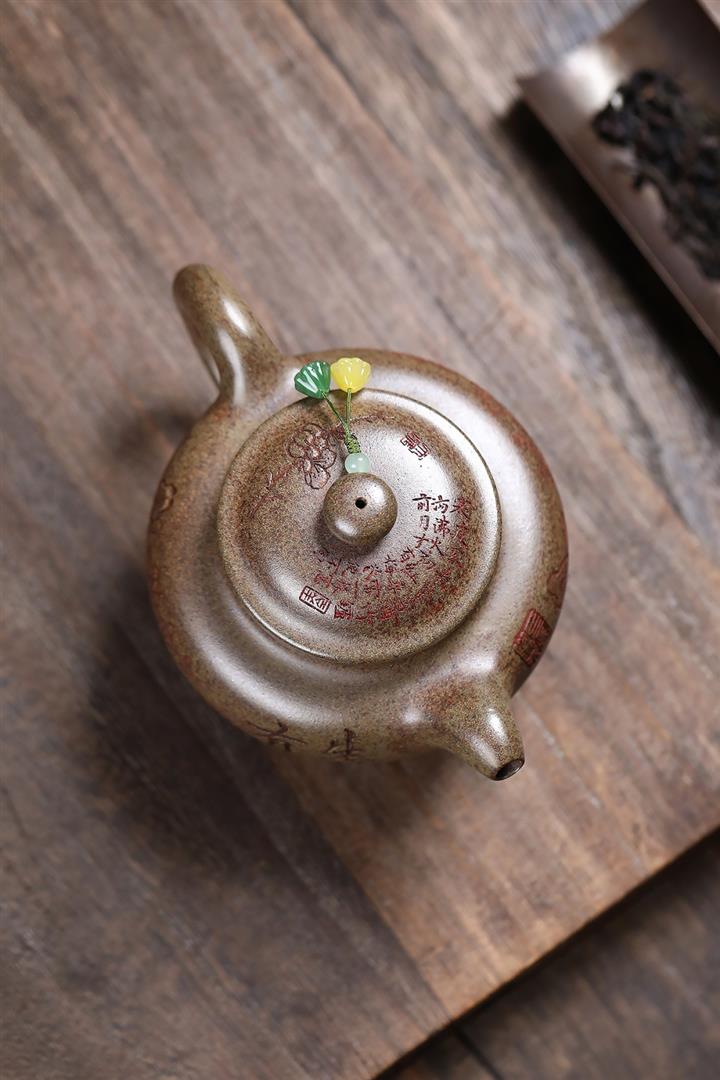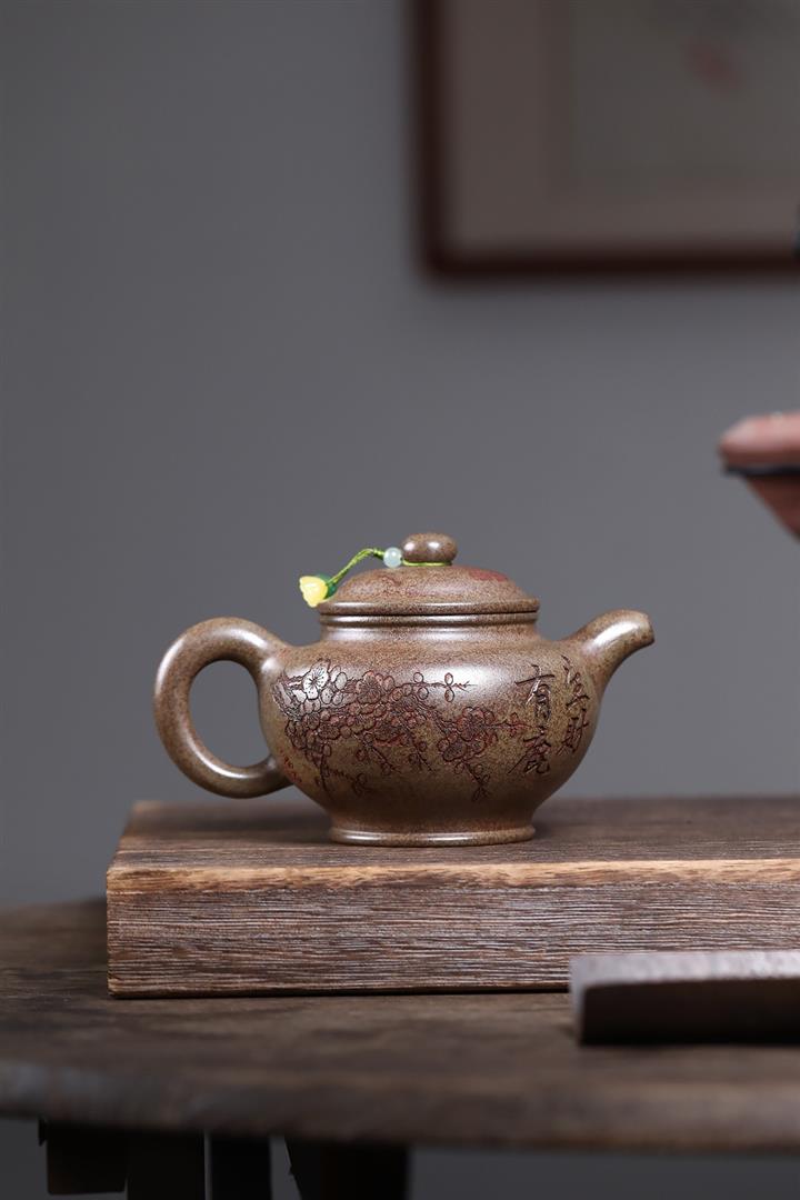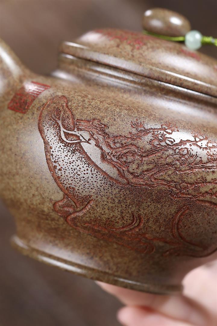 【泥料特點】砂土氣重,似淳實農民,日久使用,漸露鋒芒,養成變化,溫潤莊重。紫砂是壹種雙重氣孔結構的多孔性材質,氣孔微細,密度高。用紫砂壺沏茶,不失原味,且香不渙散,得茶之真香真味。紫砂使用越久,壺身色澤越發光亮照人,氣韻溫雅。紫砂壺長久使用器身會因撫摸擦拭,變得越發溫潤光澤。