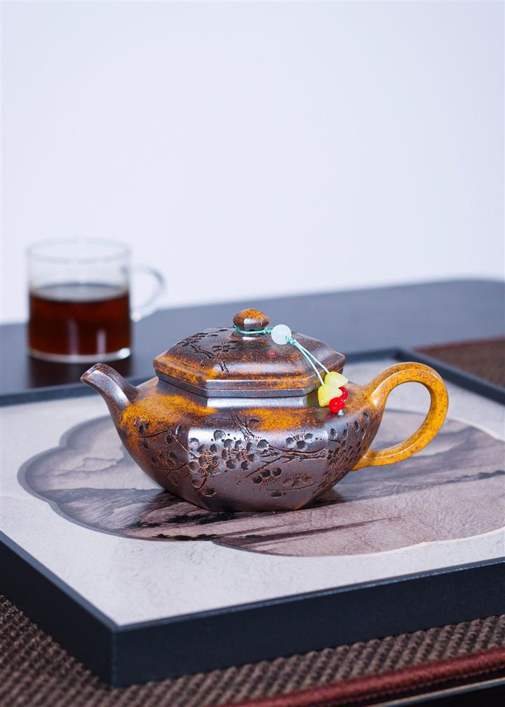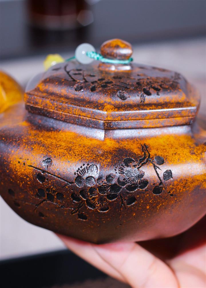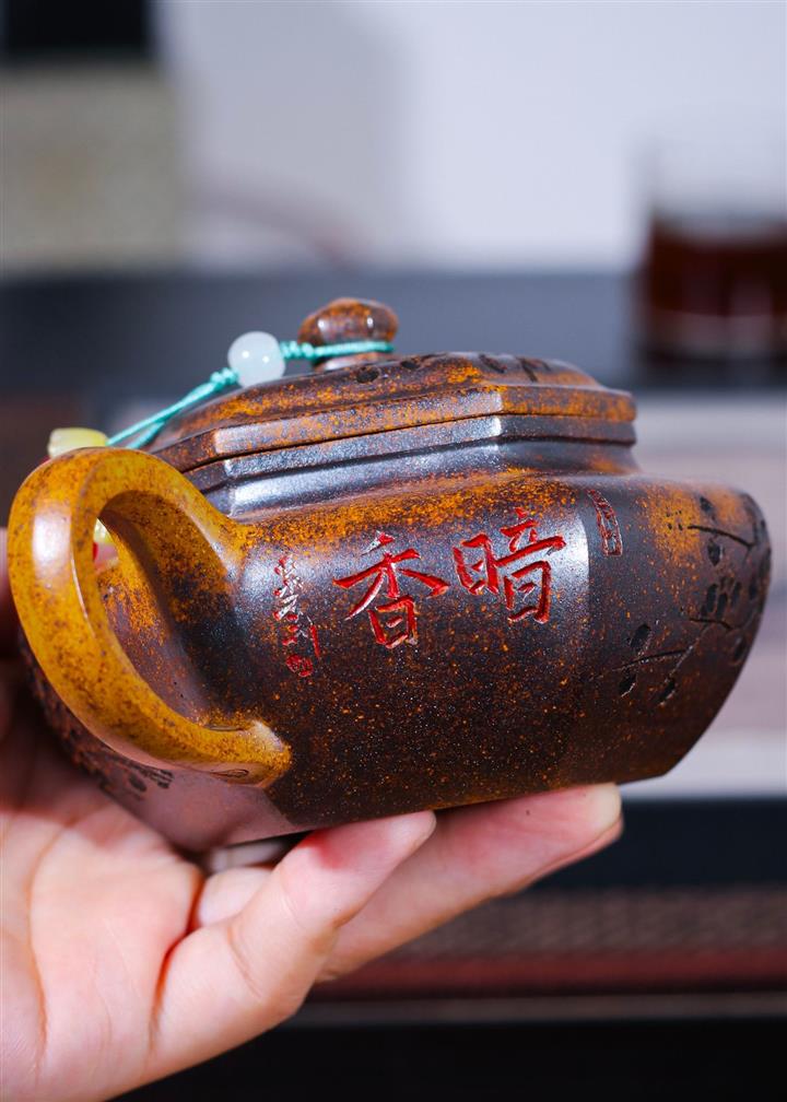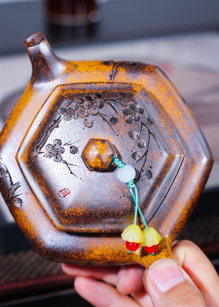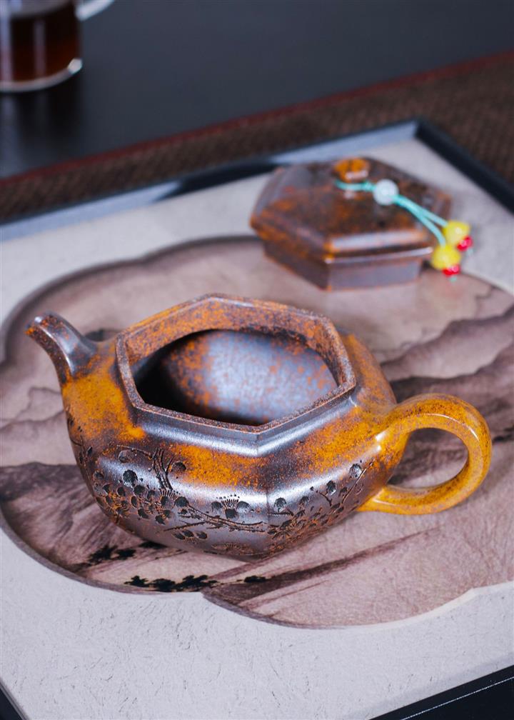 【泥料特點】砂土氣重,似淳實農民,日久使用,漸露鋒芒,養成變化,溫潤莊重。紫砂是壹種雙重氣孔結構的多孔性材質,氣孔微細,密度高。用紫砂壺沏茶,不失原味,且香不渙散,得茶之真香真味。紫砂使用越久,壺身色澤越發光亮照人,氣韻溫雅。紫砂壺長久使用器身會因撫摸擦拭,變得越發溫潤光澤。