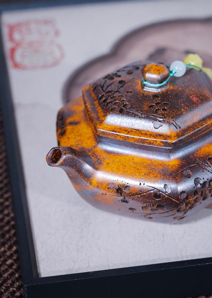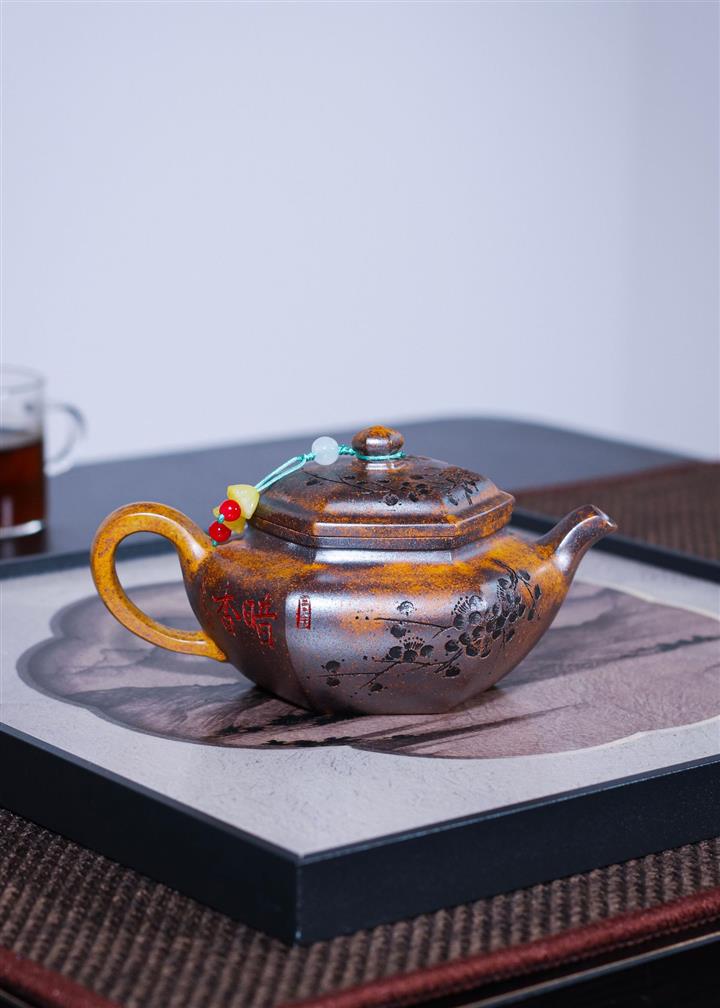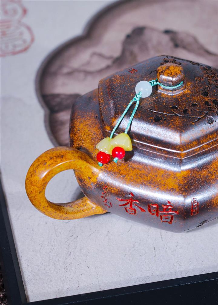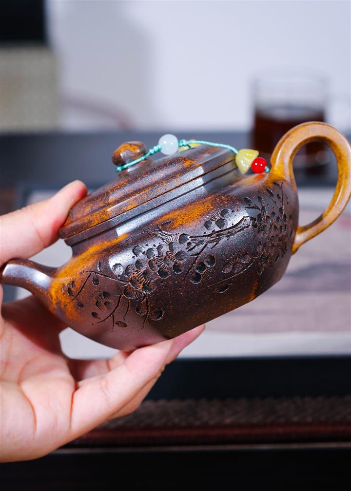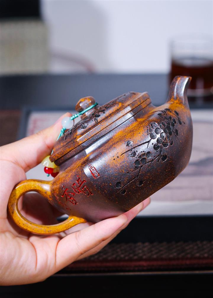 【泥料特點】砂土氣重,似淳實農民,日久使用,漸露鋒芒,養成變化,溫潤莊重。紫砂是壹種雙重氣孔結構的多孔性材質,氣孔微細,密度高。用紫砂壺沏茶,不失原味,且香不渙散,得茶之真香真味。紫砂使用越久,壺身色澤越發光亮照人,氣韻溫雅。紫砂壺長久使用器身會因撫摸擦拭,變得越發溫潤光澤。