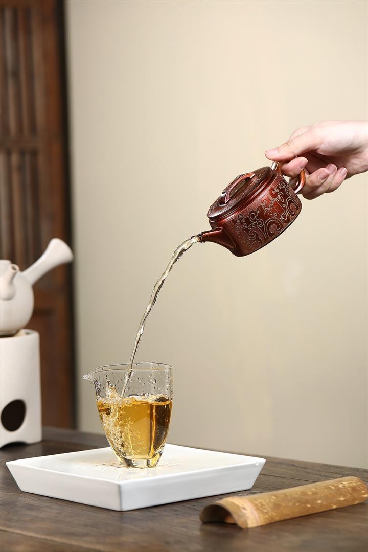 【泥料特點】砂土氣重,似淳實農民,日久使用,漸露鋒芒,養成變化,溫潤莊重。紫砂是壹種雙重氣孔結構的多孔性材質,氣孔微細,密度高。用紫砂壺沏茶,不失原味,且香不渙散,得茶之真香真味。紫砂使用越久,壺身色澤越發光亮照人,氣韻溫雅。紫砂壺長久使用器身會因撫摸擦拭,變得越發溫潤光澤。
