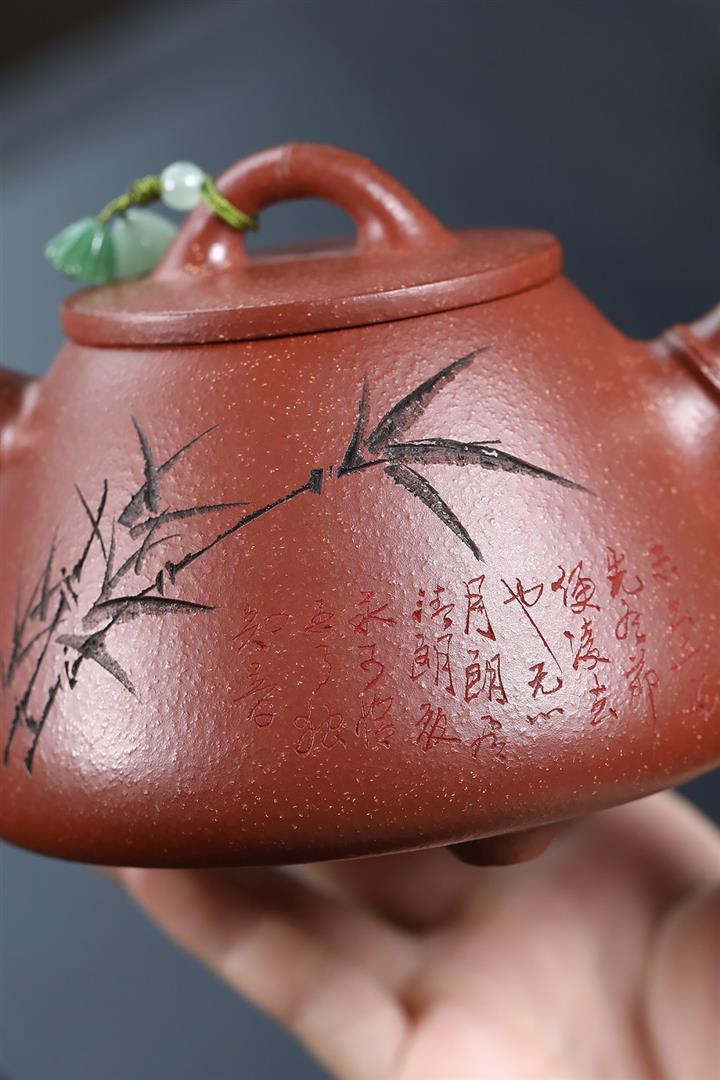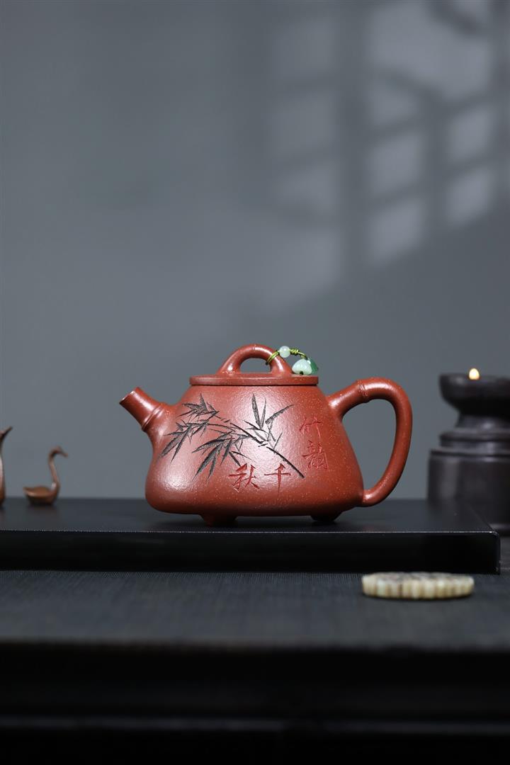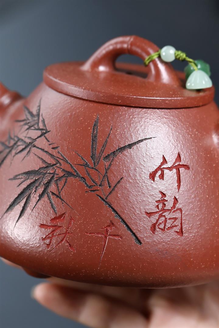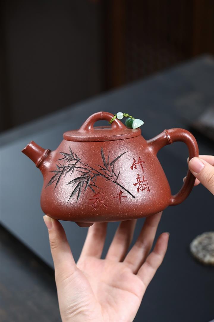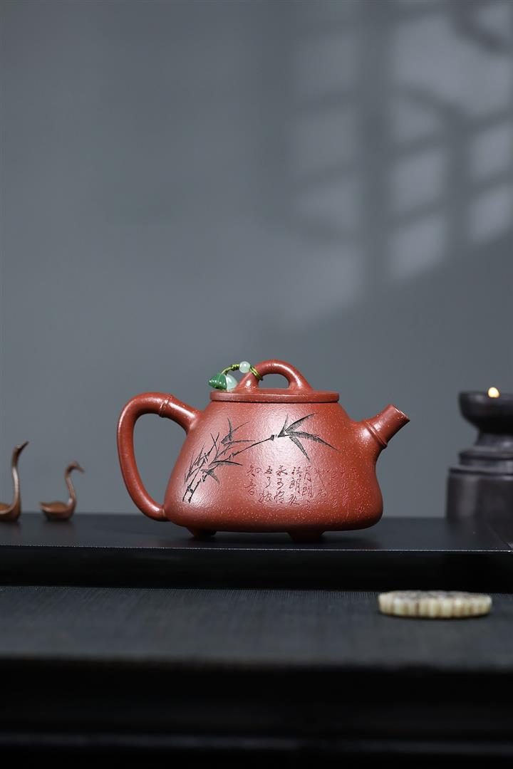 【泥料特點】砂土氣重,似淳實農民,日久使用,漸露鋒芒,養成變化,溫潤莊重。紫砂是壹種雙重氣孔結構的多孔性材質,氣孔微細,密度高。用紫砂壺沏茶,不失原味,且香不渙散,得茶之真香真味。紫砂使用越久,壺身色澤越發光亮照人,氣韻溫雅。紫砂壺長久使用器身會因撫摸擦拭,變得越發溫潤光澤。