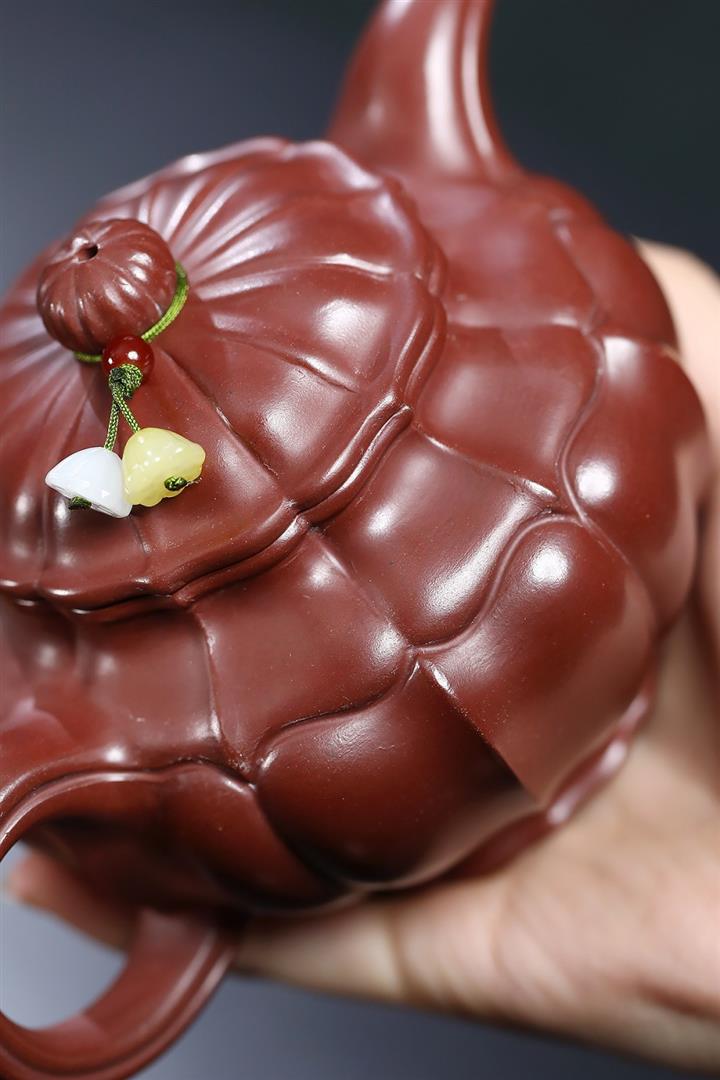 【泥料特點】砂土氣重,似淳實農民,日久使用,漸露鋒芒,養成變化,溫潤莊重。紫砂是壹種雙重氣孔結構的多孔性材質,氣孔微細,密度高。用紫砂壺沏茶,不失原味,且香不渙散,得茶之真香真味。紫砂使用越久,壺身色澤越發光亮照人,氣韻溫雅。紫砂壺長久使用器身會因撫摸擦拭,變得越發溫潤光澤。