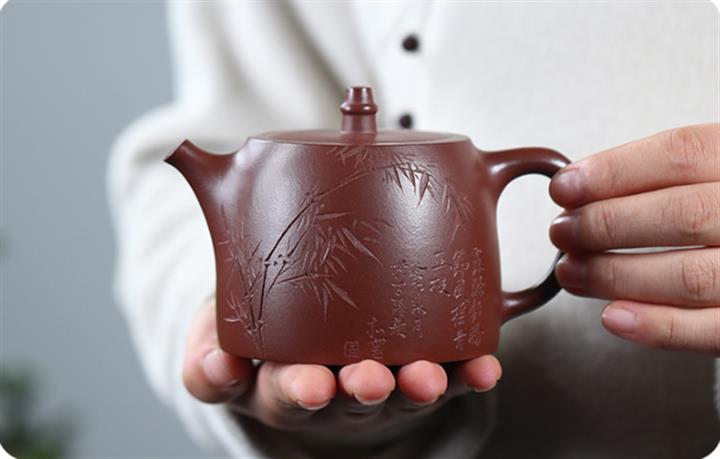 【泥料特點】砂土氣重,似淳實農民,日久使用,漸露鋒芒,養成變化,溫潤莊重。紫砂是壹種雙重氣孔結構的多孔性材質,氣孔微細,密度高。用紫砂壺沏茶,不失原味,且香不渙散,得茶之真香真味。紫砂使用越久,壺身色澤越發光亮照人,氣韻溫雅。紫砂壺長久使用器身會因撫摸擦拭,變得越發溫潤光澤。
