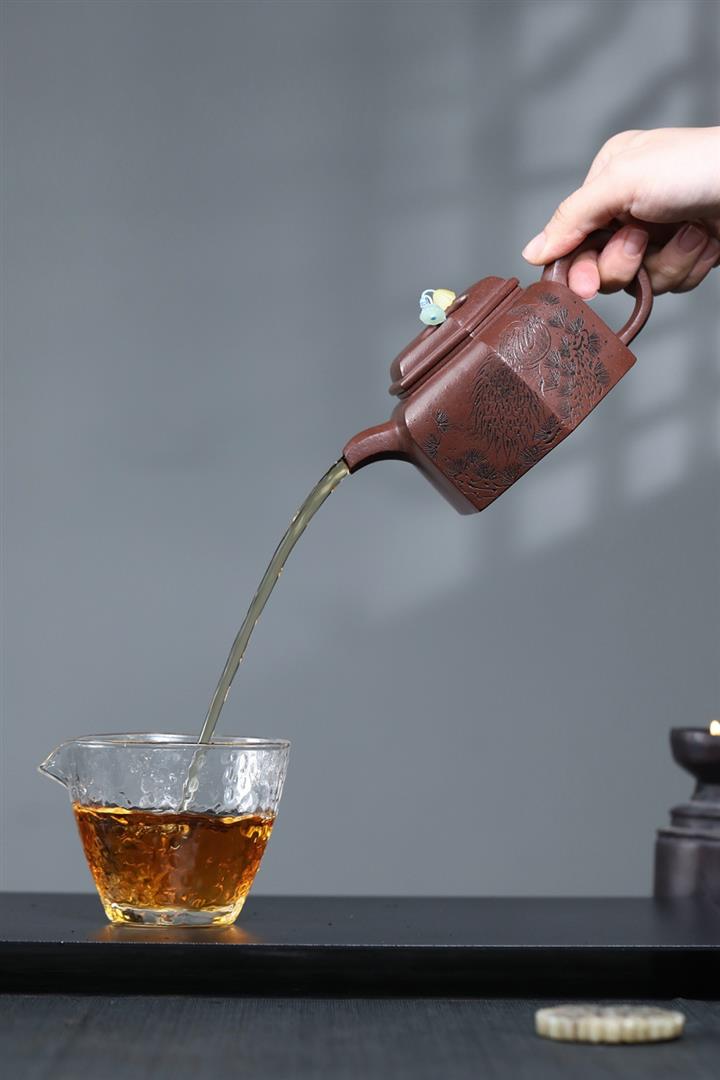 【泥料特點】砂土氣重,似淳實農民,日久使用,漸露鋒芒,養成變化,溫潤莊重。紫砂是壹種雙重氣孔結構的多孔性材質,氣孔微細,密度高。用紫砂壺沏茶,不失原味,且香不渙散,得茶之真香真味。紫砂使用越久,壺身色澤越發光亮照人,氣韻溫雅。紫砂壺長久使用器身會因撫摸擦拭,變得越發溫潤光澤。