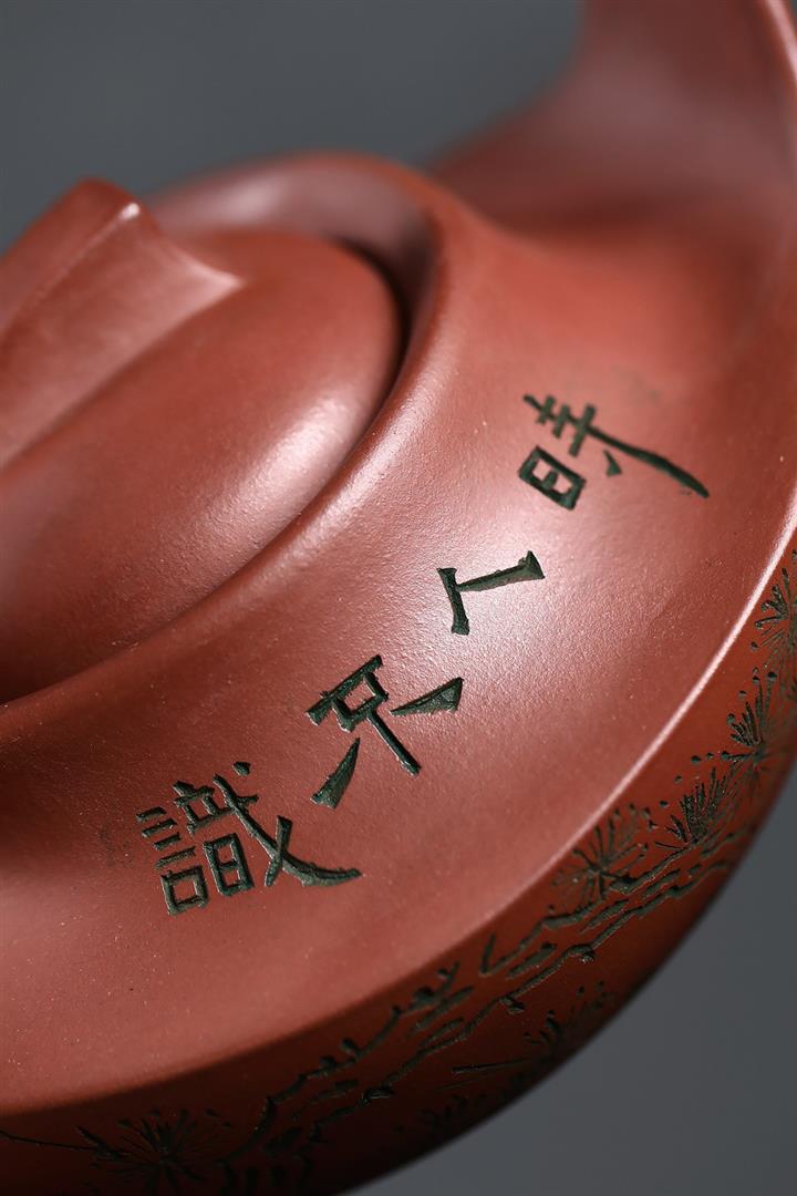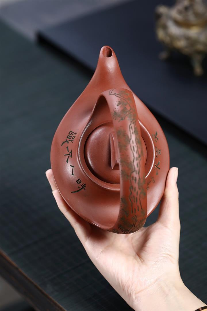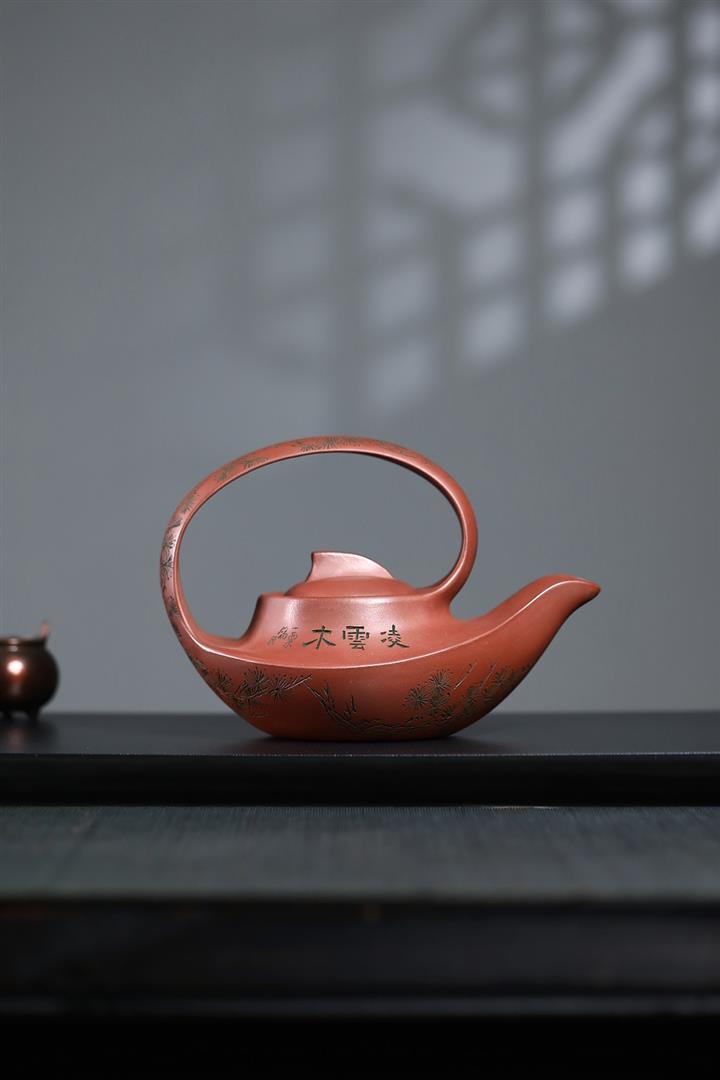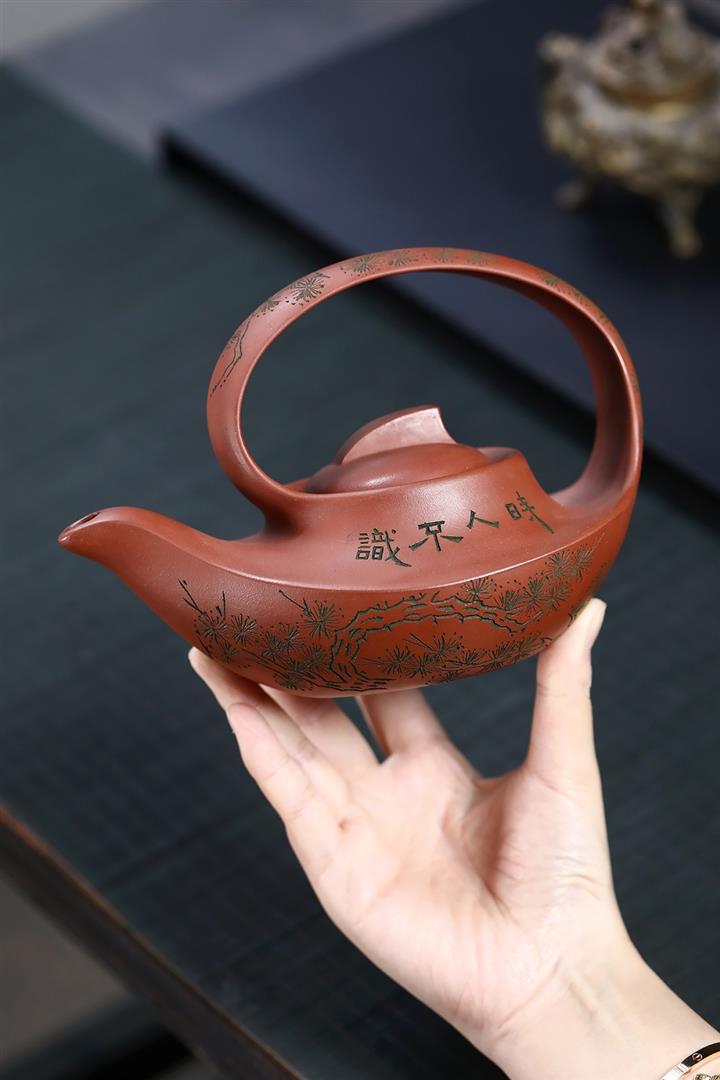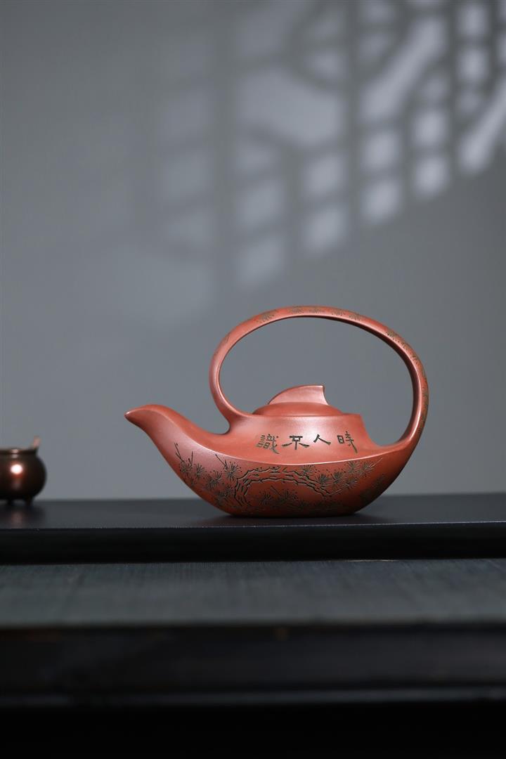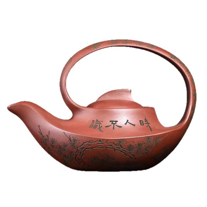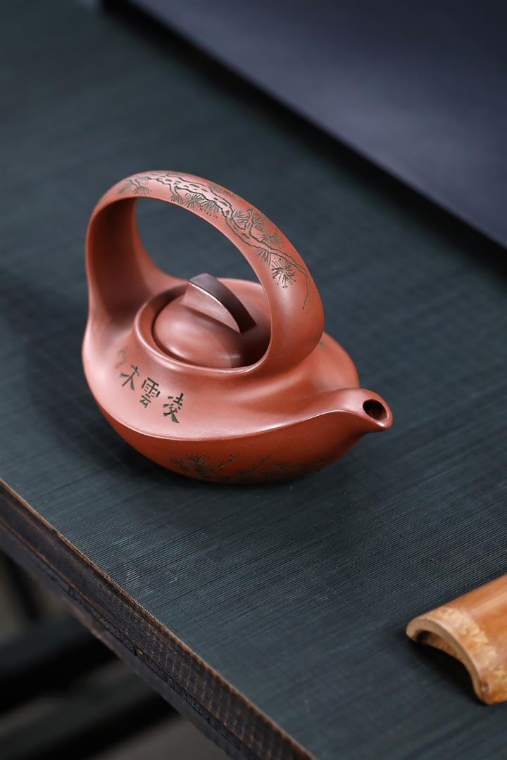 400cc原礦清水泥陶刻松影曲梁提梁茶壺POT8753