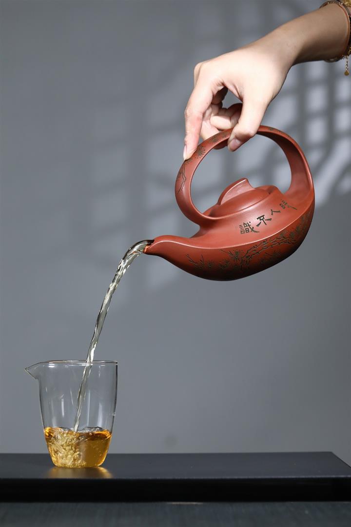 【泥料特點】砂土氣重,似淳實農民,日久使用,漸露鋒芒,養成變化,溫潤莊重。紫砂是壹種雙重氣孔結構的多孔性材質,氣孔微細,密度高。用紫砂壺沏茶,不失原味,且香不渙散,得茶之真香真味。紫砂使用越久,壺身色澤越發光亮照人,氣韻溫雅。紫砂壺長久使用器身會因撫摸擦拭,變得越發溫潤光澤。