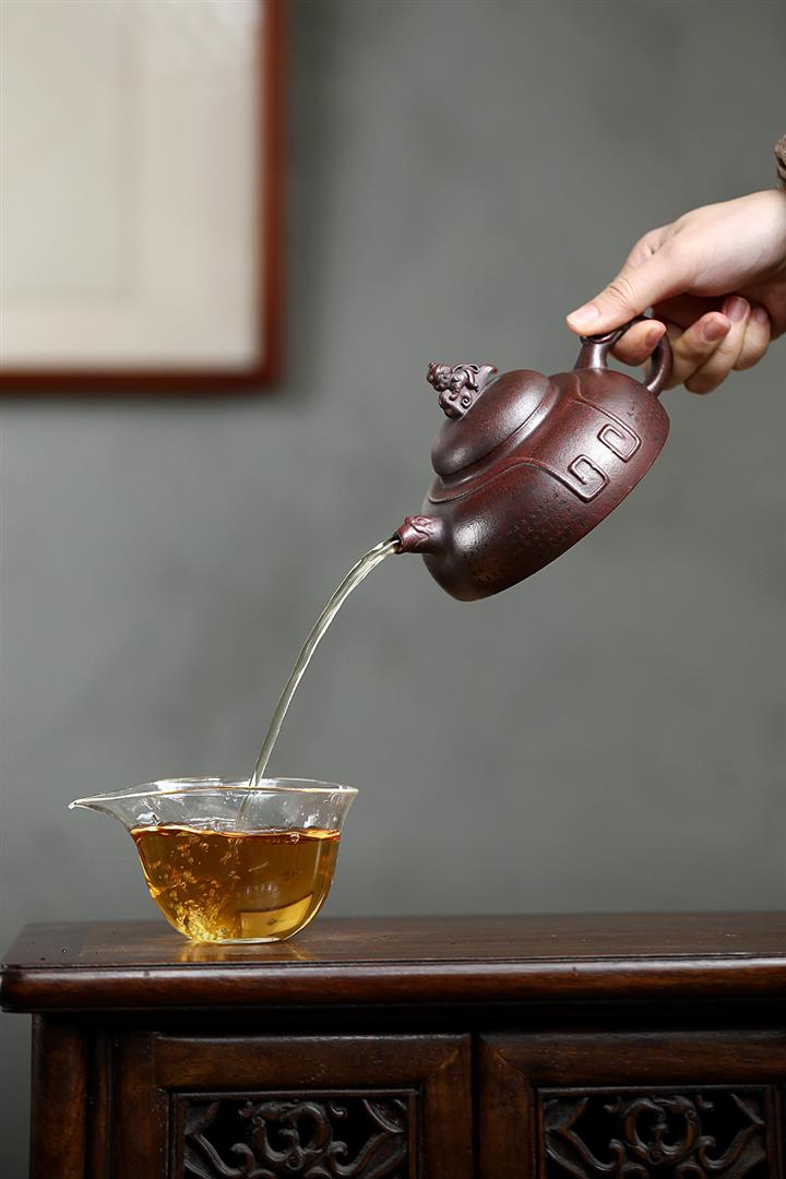 【泥料特點】砂土氣重,似淳實農民,日久使用,漸露鋒芒,養成變化,溫潤莊重。紫砂是壹種雙重氣孔結構的多孔性材質,氣孔微細,密度高。用紫砂壺沏茶,不失原味,且香不渙散,得茶之真香真味。紫砂使用越久,壺身色澤越發光亮照人,氣韻溫雅。紫砂壺長久使用器身會因撫摸擦拭,變得越發溫潤光澤。