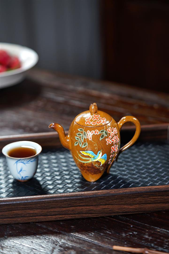 【泥料特點】砂土氣重,似淳實農民,日久使用,漸露鋒芒,養成變化,溫潤莊重。紫砂是壹種雙重氣孔結構的多孔性材質,氣孔微細,密度高。用紫砂壺沏茶,不失原味,且香不渙散,得茶之真香真味。紫砂使用越久,壺身色澤越發光亮照人,氣韻溫雅。紫砂壺長久使用器身會因撫摸擦拭,變得越發溫潤光澤。