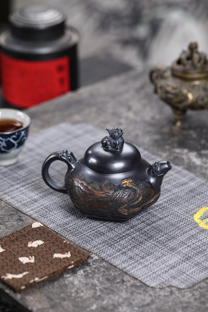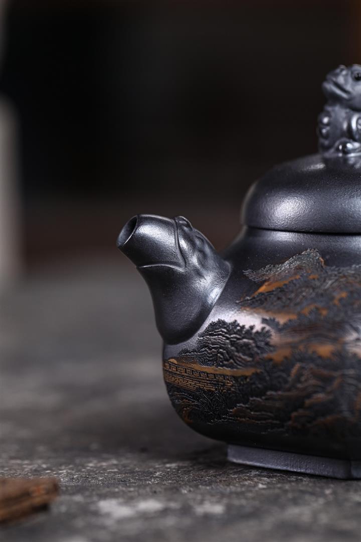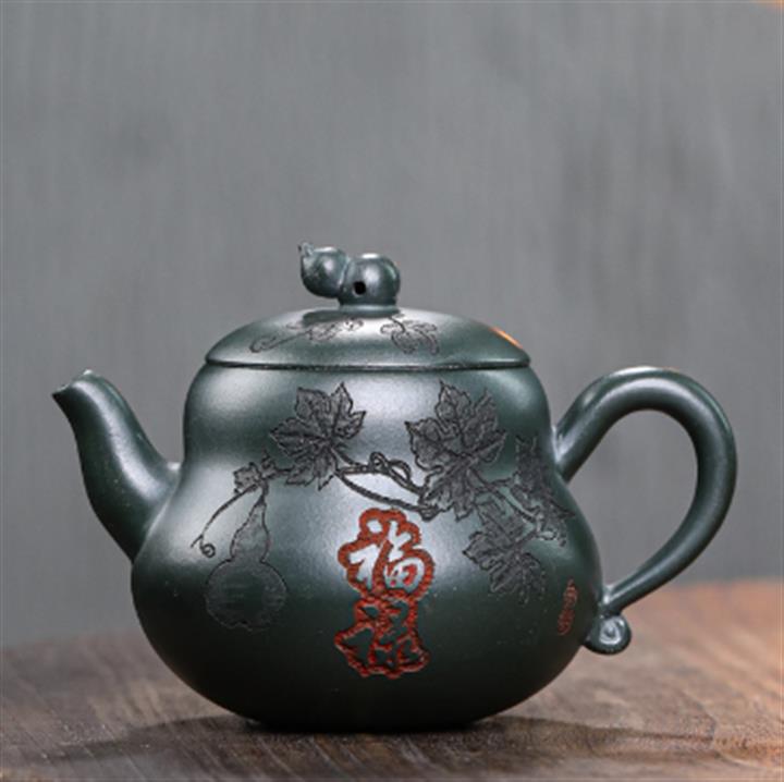 340cc原礦本山綠泥繪刻四方壺茶壺POT8887