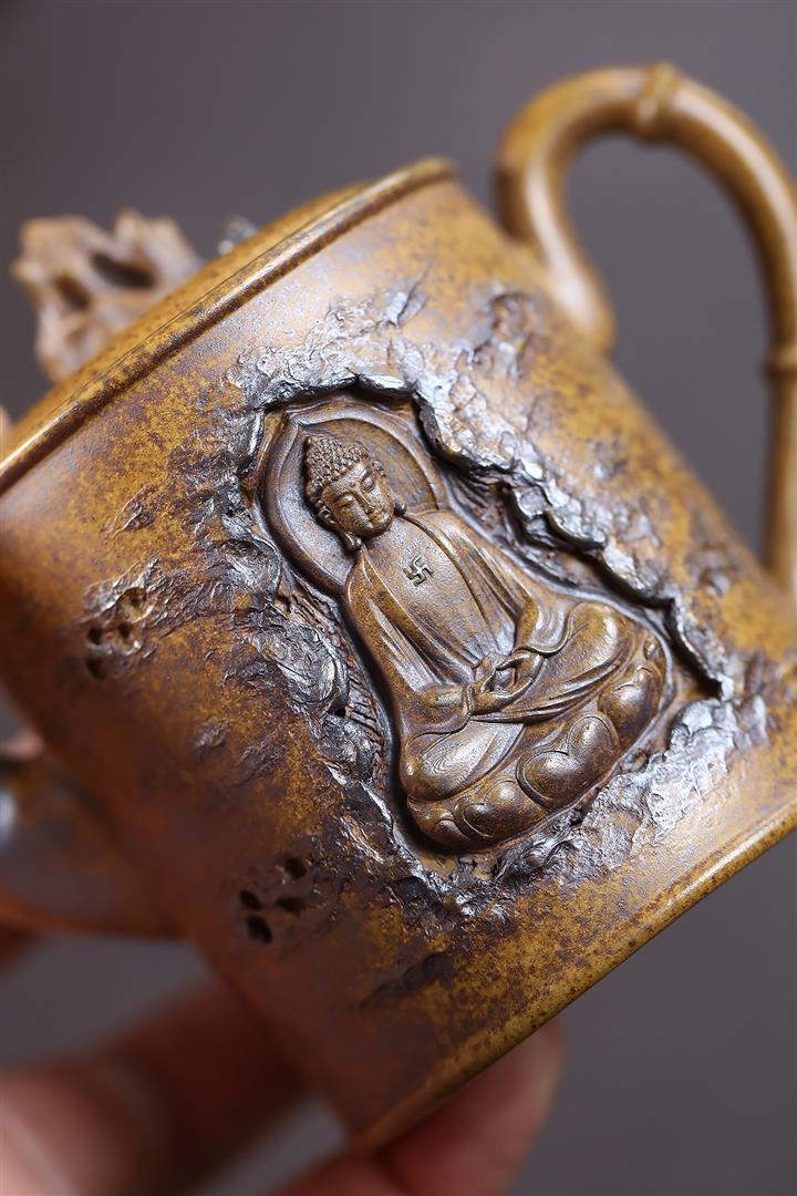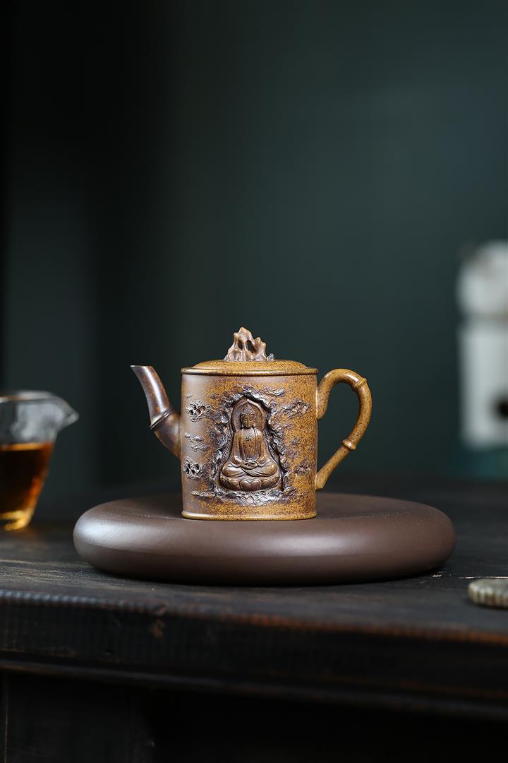 410cc原礦石黃泥彩刻蓬萊勝景茶壺POT8988