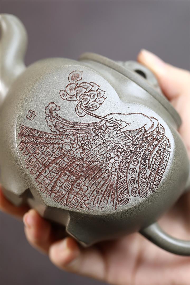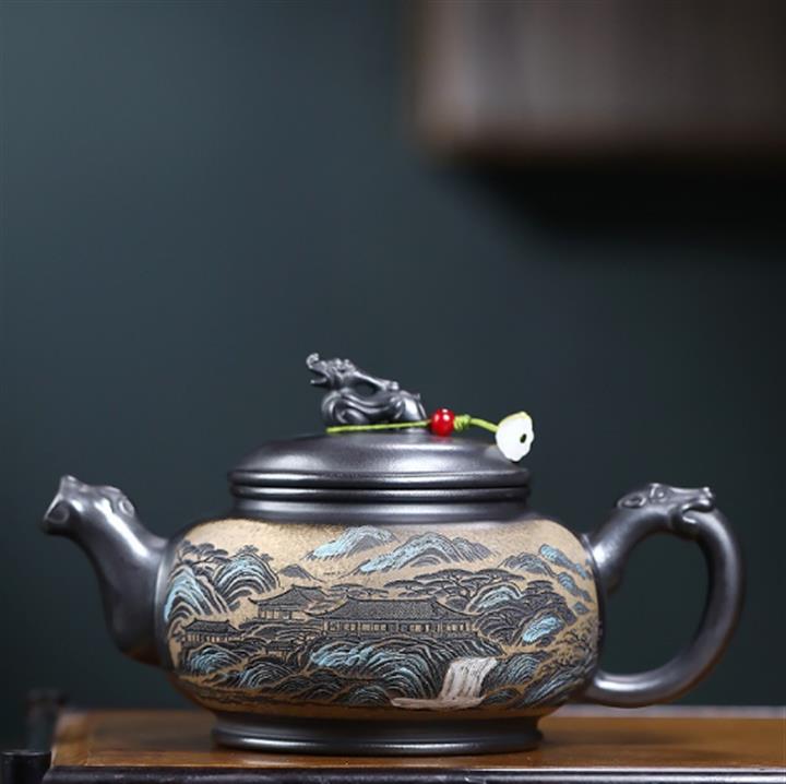 410cc原礦石黃泥彩刻蓬萊勝景茶壺POT8988