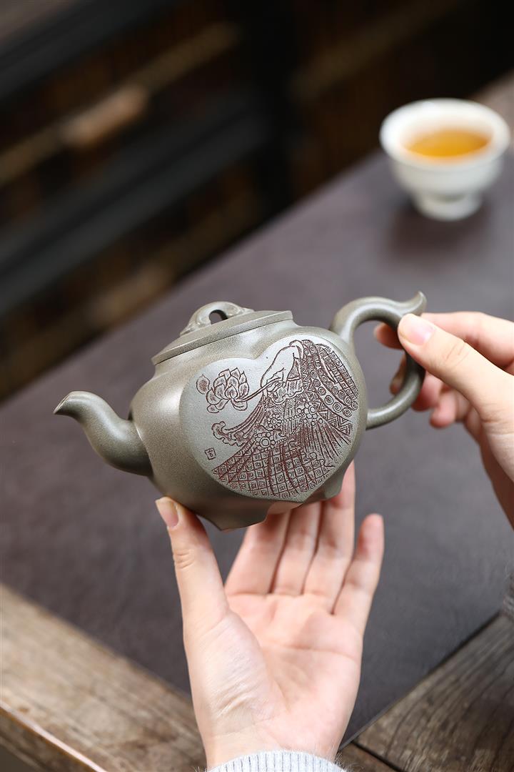 【作品介紹】此款壺形線條流暢,壺把,壺嘴,壺身壹氣呵成栩栩如生,是收藏把玩的好壺,泥料色澤古樸典雅,日久使用,漸露鋒芒,養成變化快,溫潤莊重,用其泡茶,使用的年代久,壺身就溫潤,泡出來的茶湯也就醇郁芳馨。