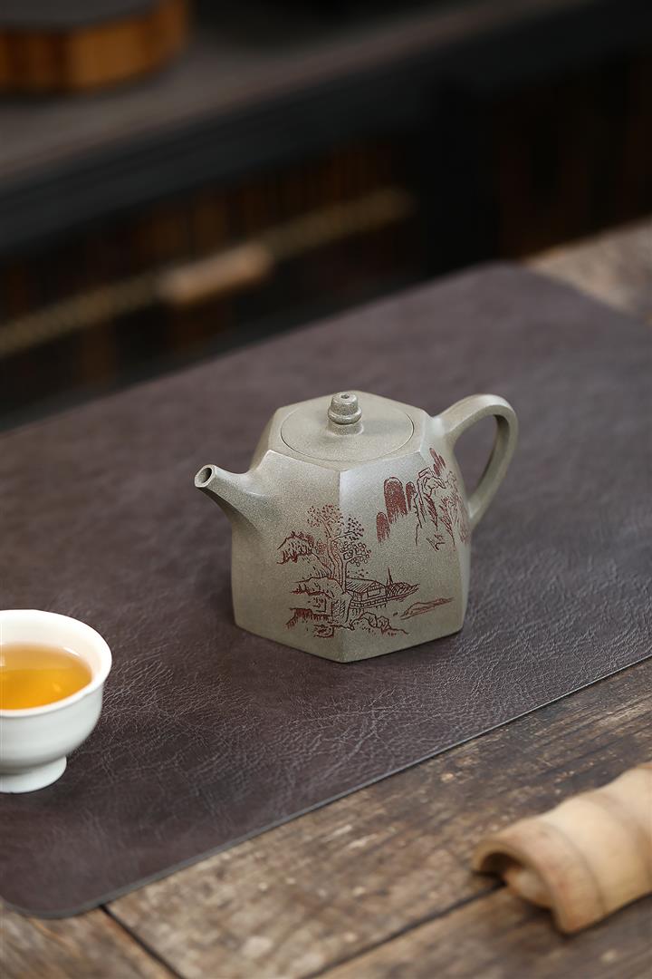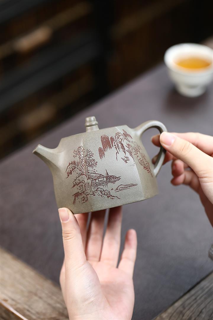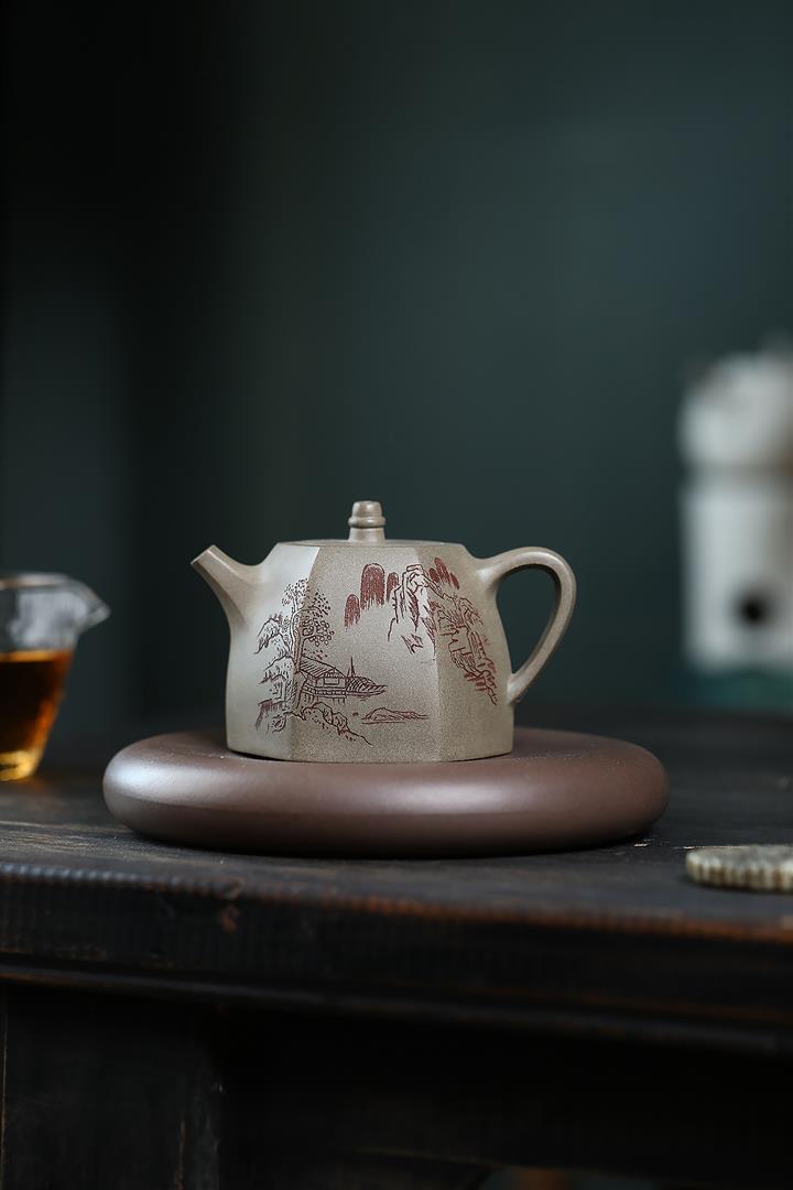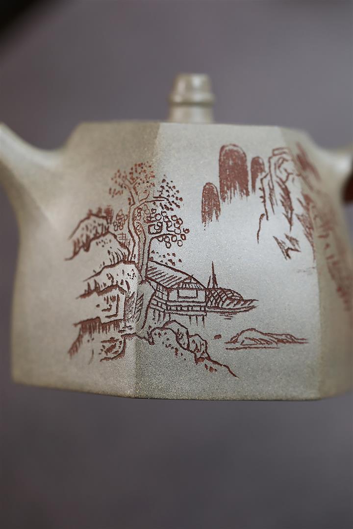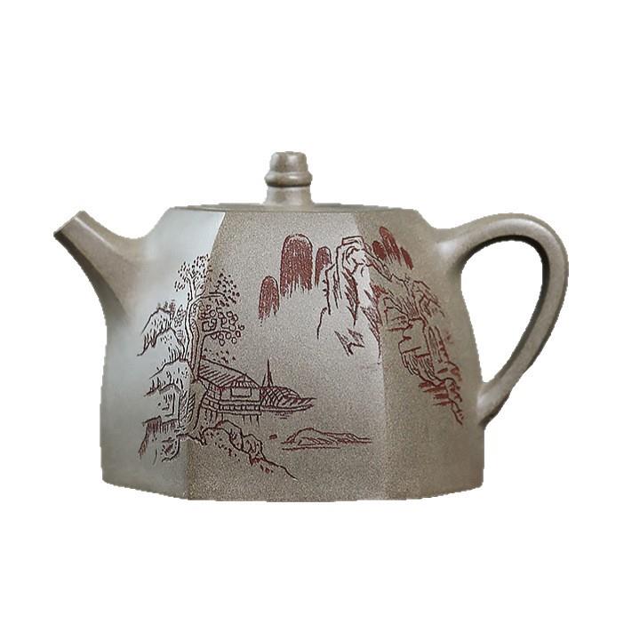 410cc原礦石黃泥彩刻蓬萊勝景茶壺POT8988