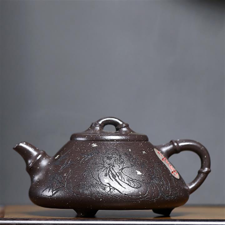 240cc龍山古烏泥山水四方竹段茶壺POT9036