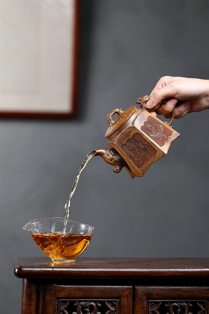 【泥料特點】砂土氣重,似淳實農民,日久使用,漸露鋒芒,養成變化,溫潤莊重。紫砂是壹種雙重氣孔結構的多孔性材質,氣孔微細,密度高。用紫砂壺沏茶,不失原味,且香不渙散,得茶之真香真味。紫砂使用越久,壺身色澤越發光亮照人,氣韻溫雅。紫砂壺長久使用器身會因撫摸擦拭,變得越發溫潤光澤。
