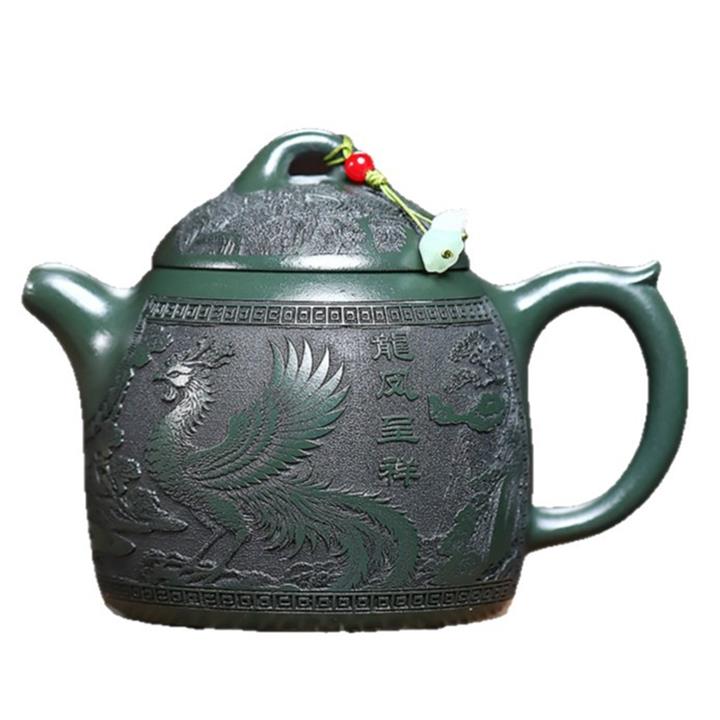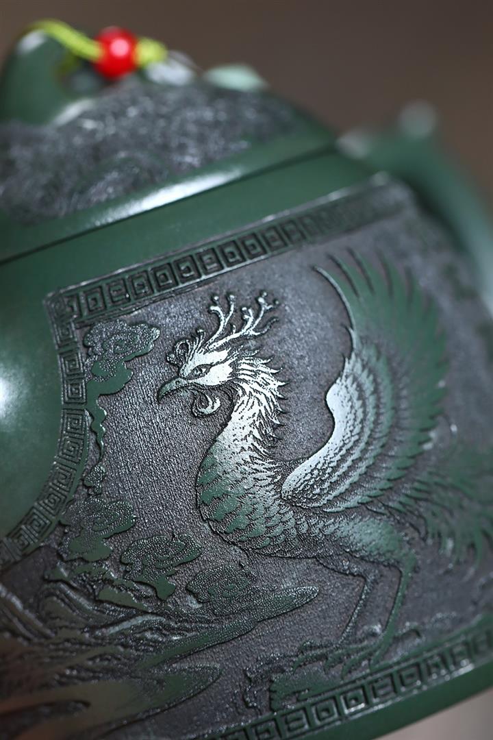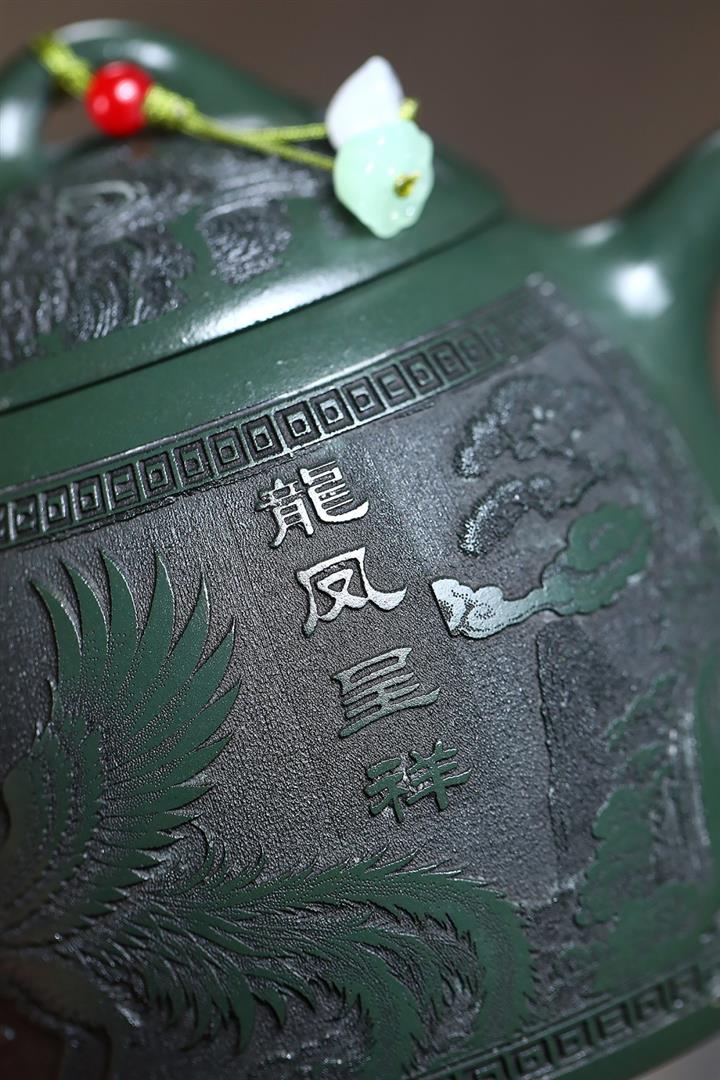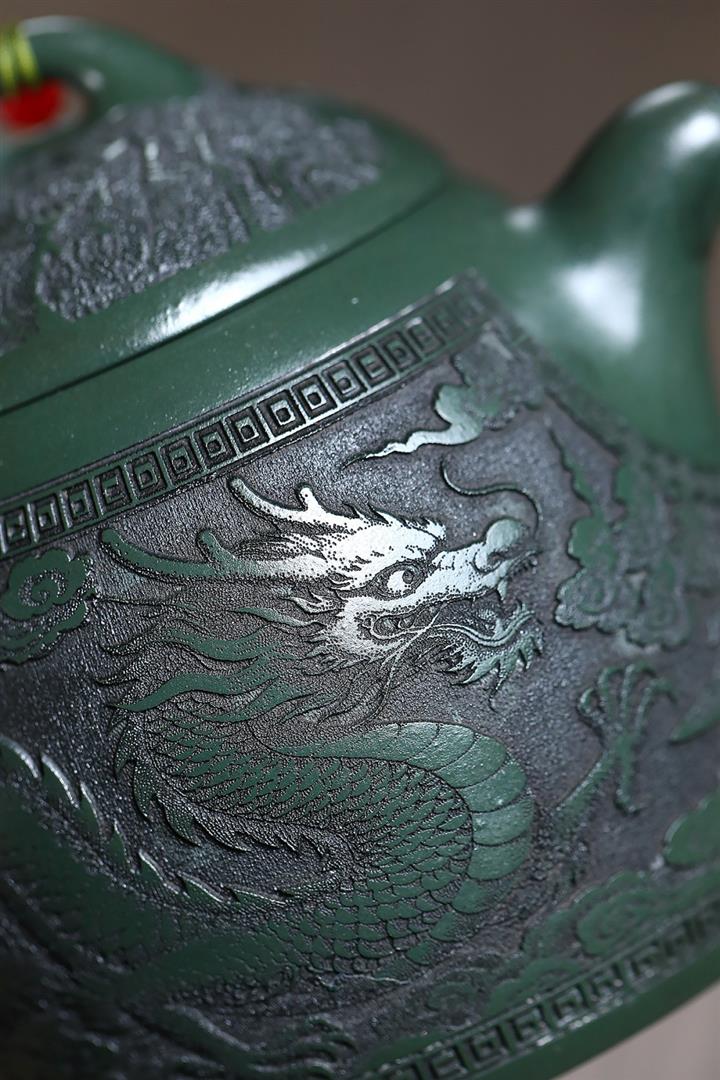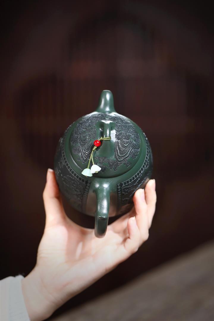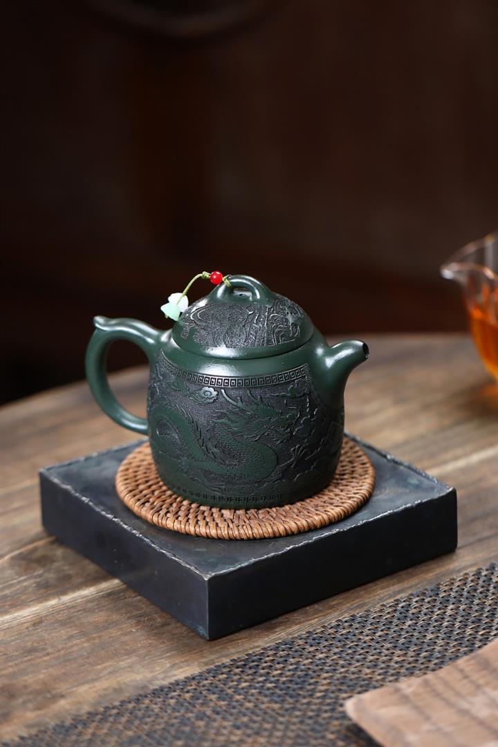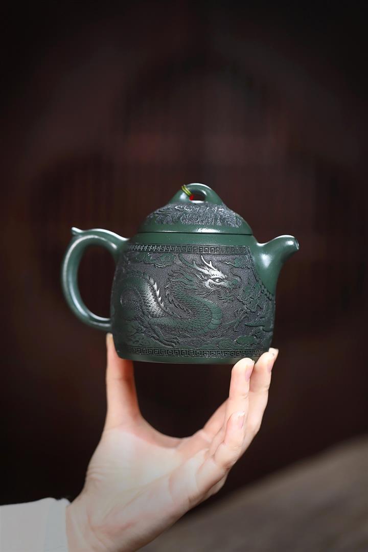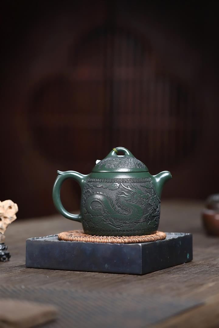390cc原礦綠泥江山龍吟滿刻秦權茶壺POT9124