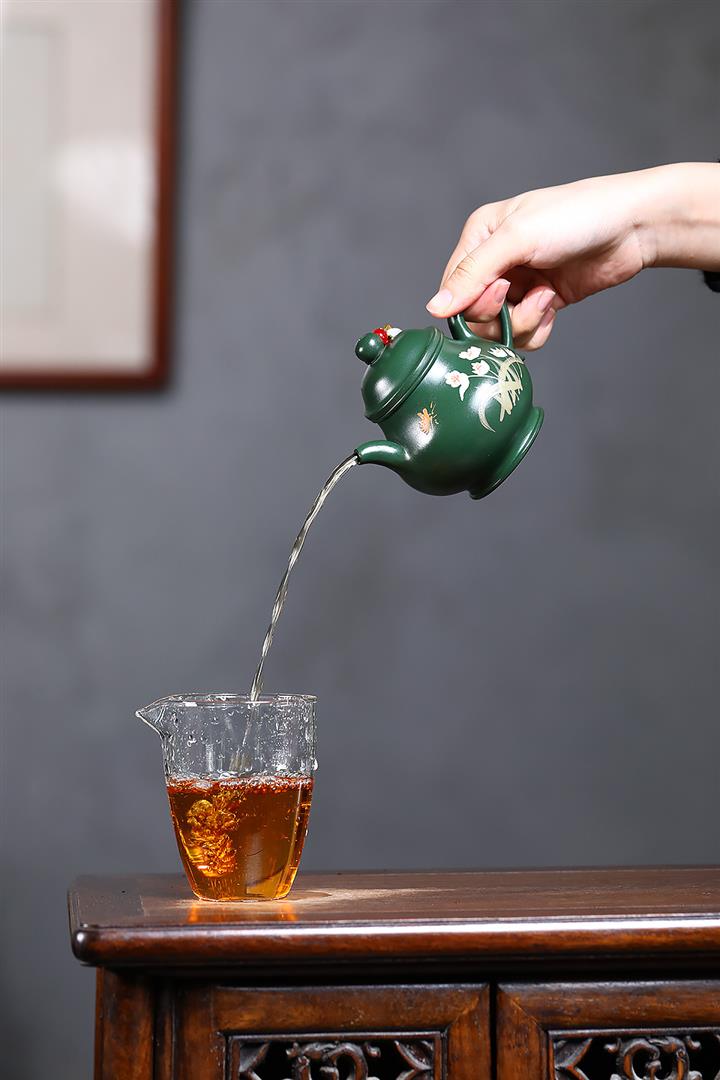 【泥料特點】砂土氣重,似淳實農民,日久使用,漸露鋒芒,養成變化,溫潤莊重。紫砂是壹種雙重氣孔結構的多孔性材質,氣孔微細,密度高。用紫砂壺沏茶,不失原味,且香不渙散,得茶之真香真味。紫砂使用越久,壺身色澤越發光亮照人,氣韻溫雅。紫砂壺長久使用器身會因撫摸擦拭,變得越發溫潤光澤。