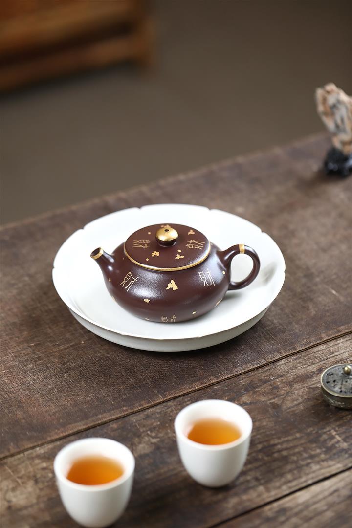 160cc原礦紫泥壹壺兩杯描金扁柿茶壺POT9282