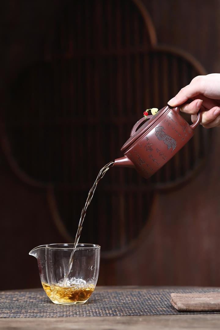 【泥料特點】砂土氣重,似淳實農民,日久使用,漸露鋒芒,養成變化,溫潤莊重。紫砂是壹種雙重氣孔結構的多孔性材質,氣孔微細,密度高。用紫砂壺沏茶,不失原味,且香不渙散,得茶之真香真味。紫砂使用越久,壺身色澤越發光亮照人,氣韻溫雅。紫砂壺長久使用器身會因撫摸擦拭,變得越發溫潤光澤。