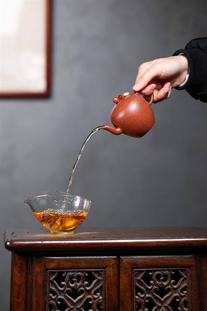 【泥料特點】砂土氣重,似淳實農民,日久使用,漸露鋒芒,養成變化,溫潤莊重。紫砂是壹種雙重氣孔結構的多孔性材質,氣孔微細,密度高。用紫砂壺沏茶,不失原味,且香不渙散,得茶之真香真味。紫砂使用越久,壺身色澤越發光亮照人,氣韻溫雅。紫砂壺長久使用器身會因撫摸擦拭,變得越發溫潤光澤。