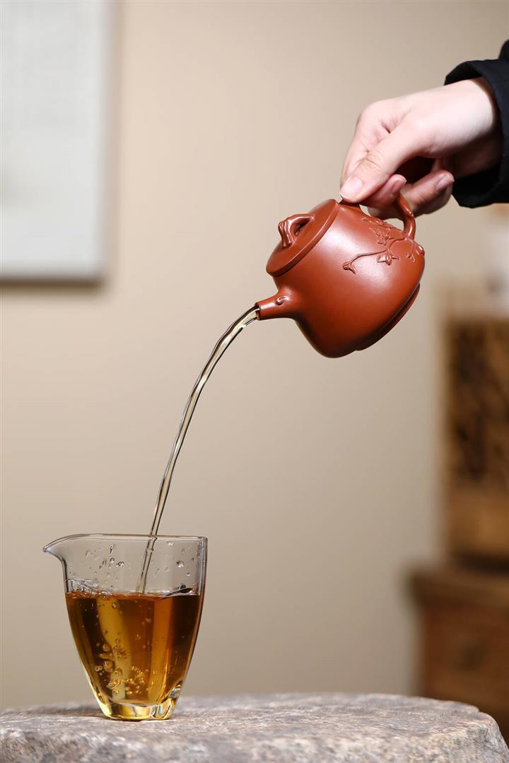 【泥料特點】砂土氣重,似淳實農民,日久使用,漸露鋒芒,養成變化,溫潤莊重。紫砂是壹種雙重氣孔結構的多孔性材質,氣孔微細,密度高。用紫砂壺沏茶,不失原味,且香不渙散,得茶之真香真味。紫砂使用越久,壺身色澤越發光亮照人,氣韻溫雅。紫砂壺長久使用器身會因撫摸擦拭,變得越發溫潤光澤。