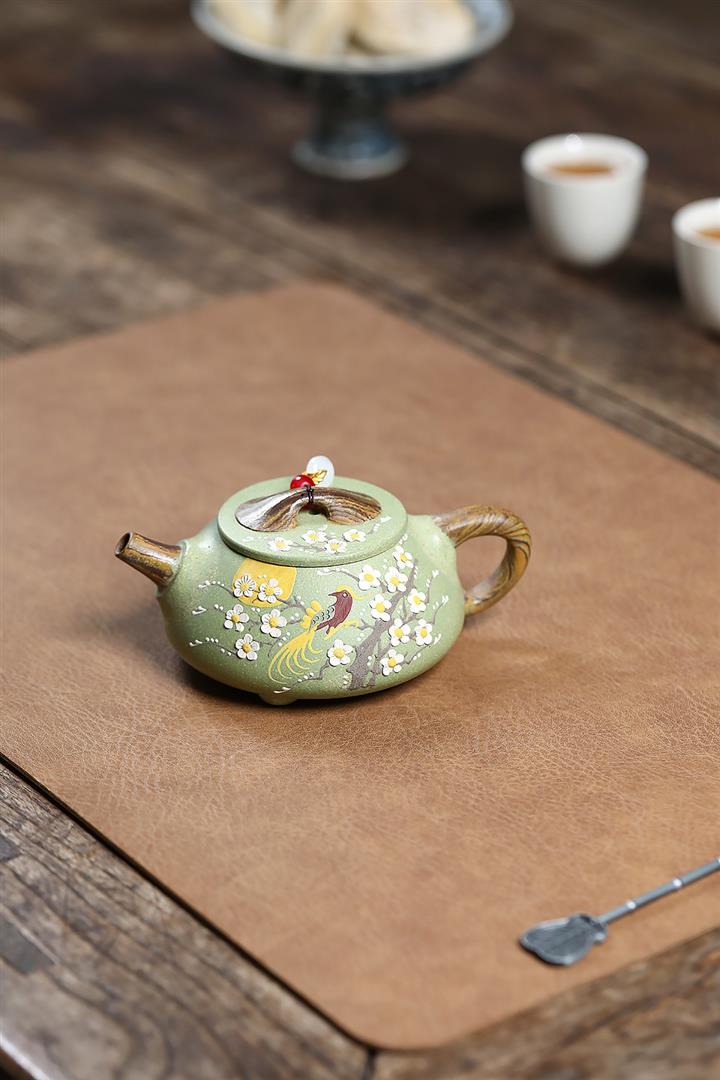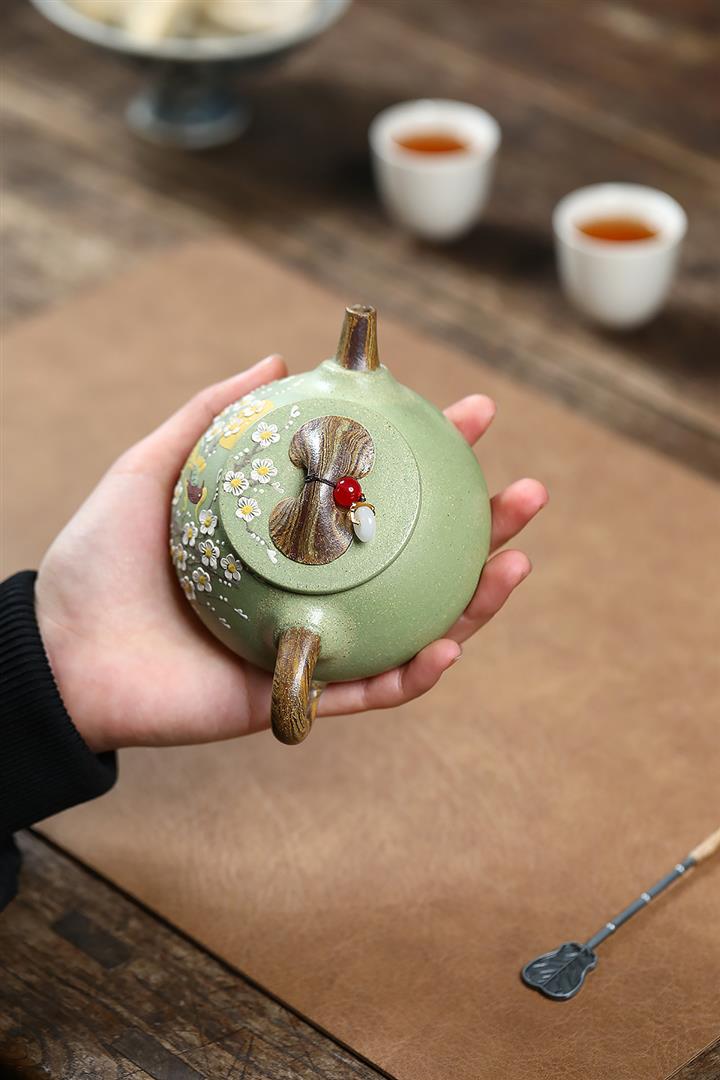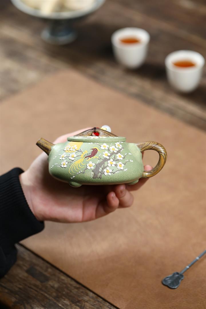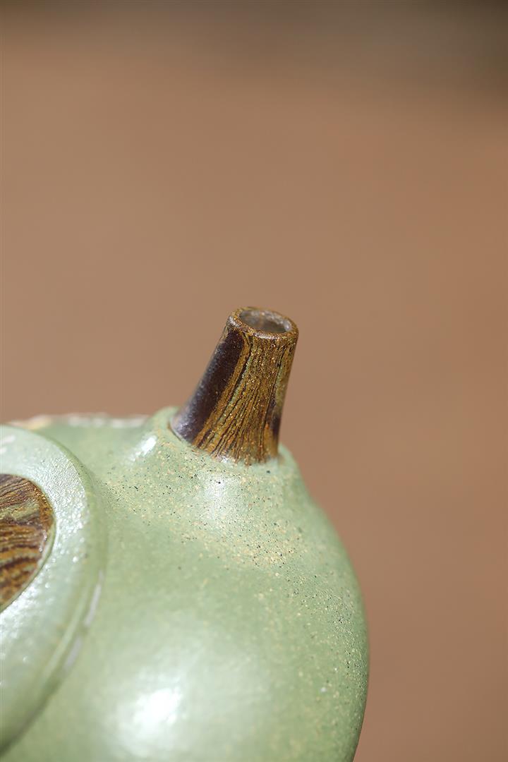 200cc原礦豆青砂絞泥喜上梅梢泡茶壺POT9479