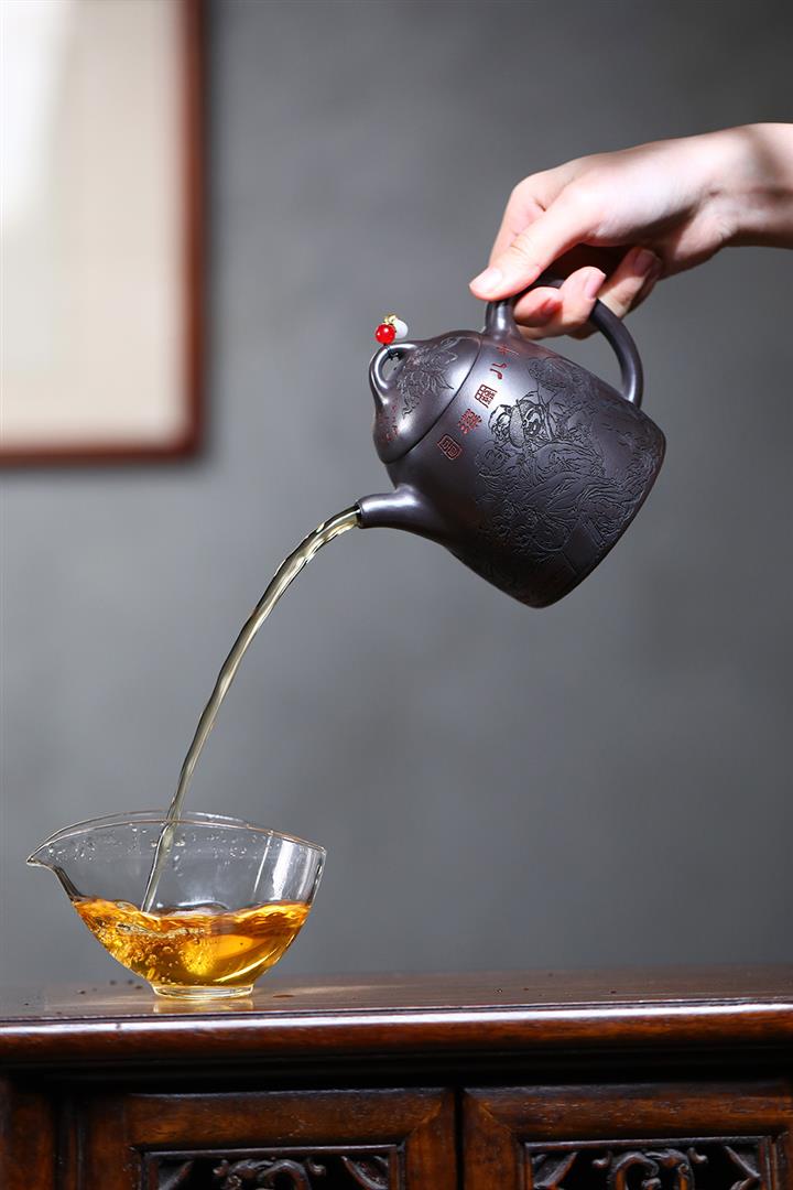 【泥料特點】砂土氣重,似淳實農民,日久使用,漸露鋒芒,養成變化,溫潤莊重。紫砂是壹種雙重氣孔結構的多孔性材質,氣孔微細,密度高。用紫砂壺沏茶,不失原味,且香不渙散,得茶之真香真味。紫砂使用越久,壺身色澤越發光亮照人,氣韻溫雅。紫砂壺長久使用器身會因撫摸擦拭,變得越發溫潤光澤。