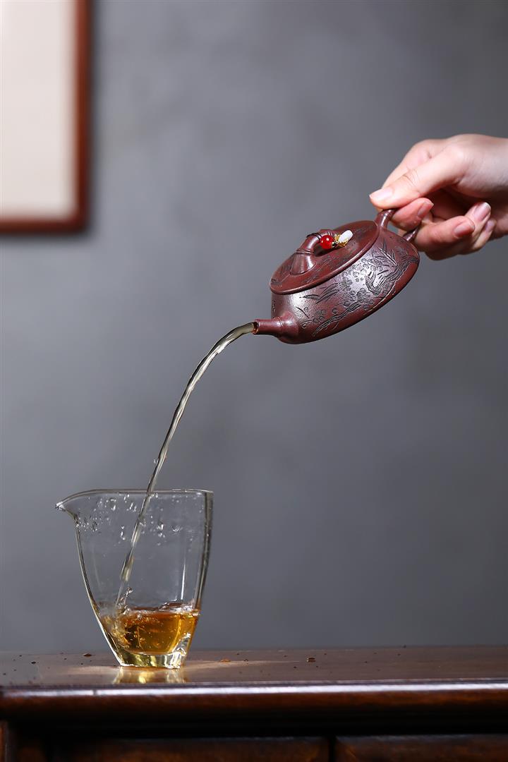 【泥料特點】砂土氣重,似淳實農民,日久使用,漸露鋒芒,養成變化,溫潤莊重。紫砂是壹種雙重氣孔結構的多孔性材質,氣孔微細,密度高。用紫砂壺沏茶,不失原味,且香不渙散,得茶之真香真味。紫砂使用越久,壺身色澤越發光亮照人,氣韻溫雅。紫砂壺長久使用器身會因撫摸擦拭,變得越發溫潤光澤。