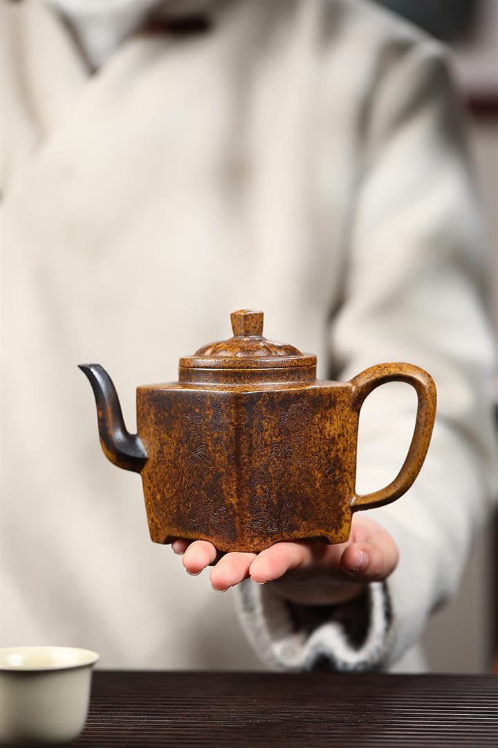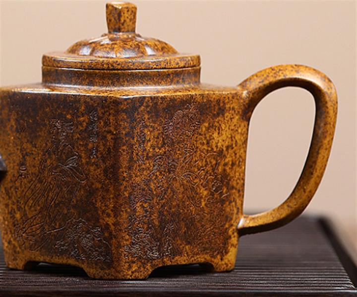 【泥料特點】砂土氣重,似淳實農民,日久使用,漸露鋒芒,養成變化,溫潤莊重。紫砂是壹種雙重氣孔結構的多孔性材質,氣孔微細,密度高。用紫砂壺沏茶,不失原味,且香不渙散,得茶之真香真味。紫砂使用越久,壺身色澤越發光亮照人,氣韻溫雅。紫砂壺長久使用器身會因撫摸擦拭,變得越發溫潤光澤。