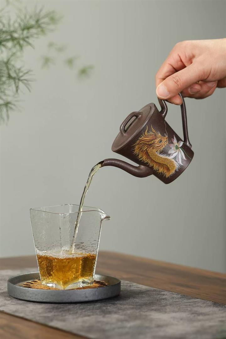 【泥料特點】砂土氣重,似淳實農民,日久使用,漸露鋒芒,養成變化,溫潤莊重。紫砂是壹種雙重氣孔結構的多孔性材質,氣孔微細,密度高。用紫砂壺沏茶,不失原味,且香不渙散,得茶之真香真味。紫砂使用越久,壺身色澤越發光亮照人,氣韻溫雅。紫砂壺長久使用器身會因撫摸擦拭,變得越發溫潤光澤。