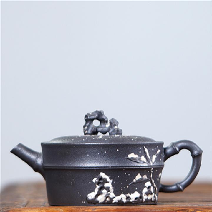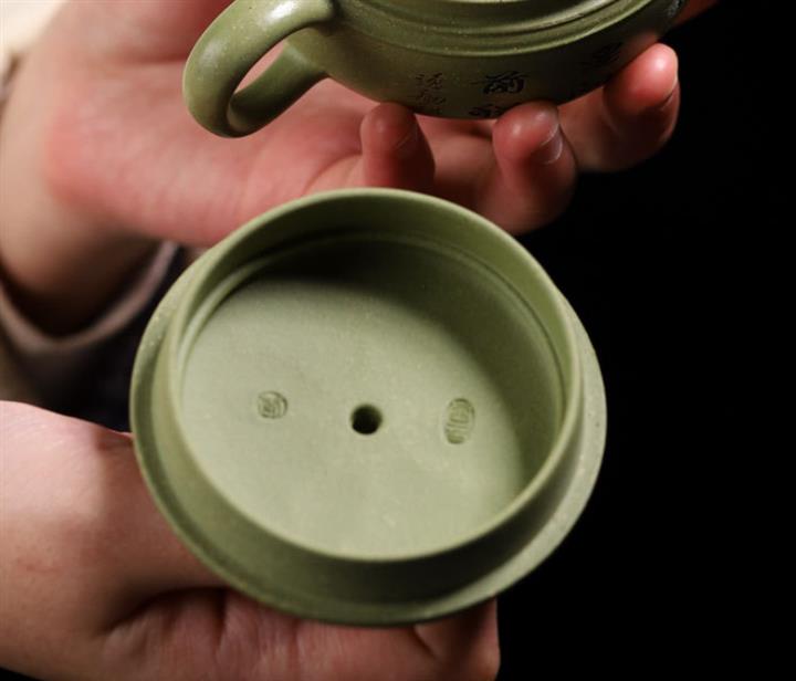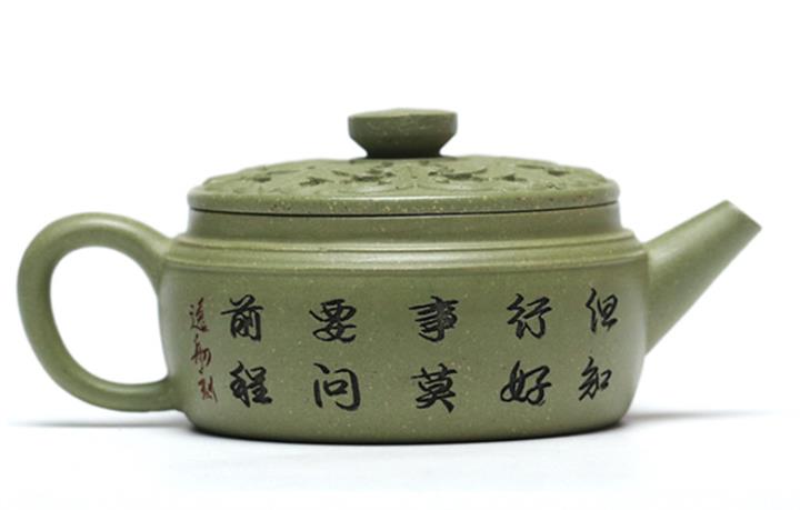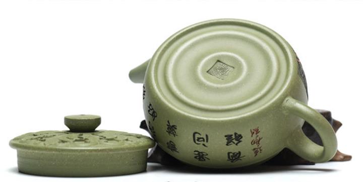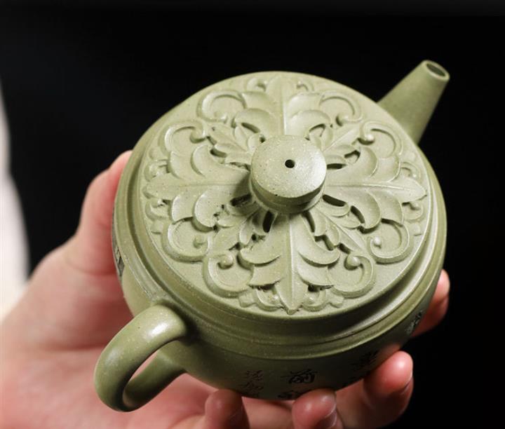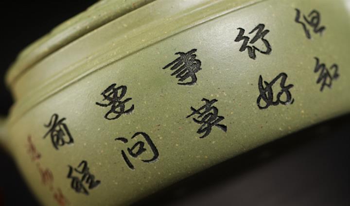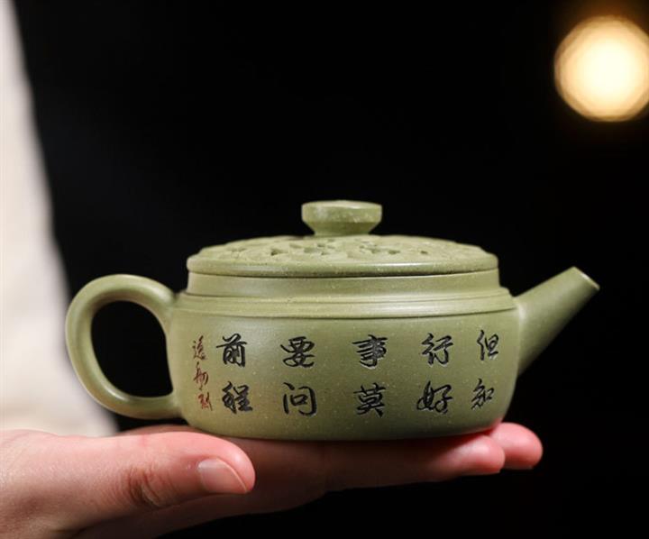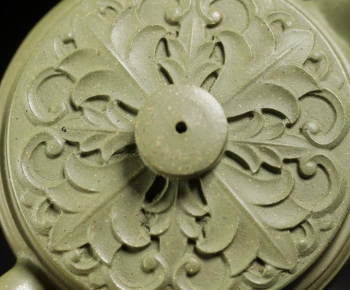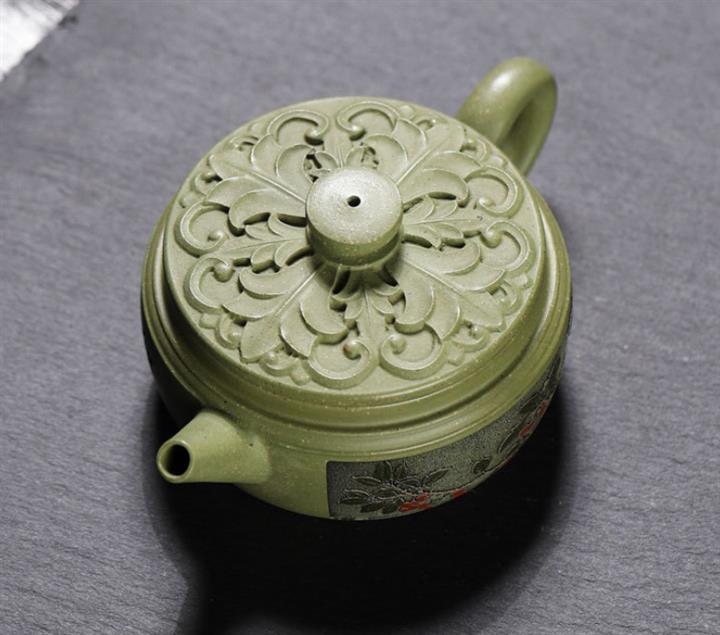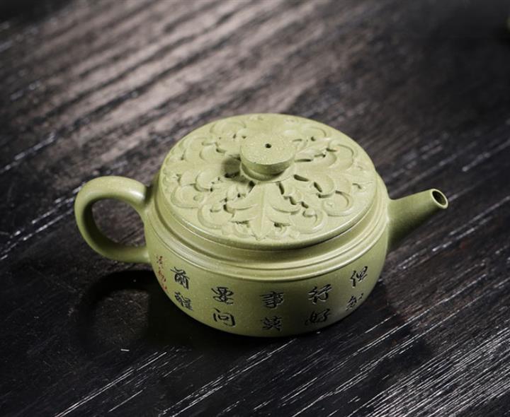 180cc原礦豆青砂竹刻虛扁泡茶壺POT9784