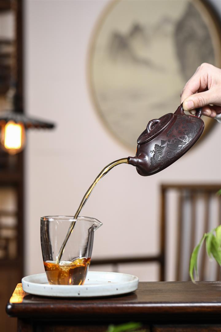 【泥料特點】砂土氣重,似淳實農民,日久使用,漸露鋒芒,養成變化,溫潤莊重。紫砂是壹種雙重氣孔結構的多孔性材質,氣孔微細,密度高。用紫砂壺沏茶,不失原味,且香不渙散,得茶之真香真味。紫砂使用越久,壺身色澤越發光亮照人,氣韻溫雅。紫砂壺長久使用器身會因撫摸擦拭,變得越發溫潤光澤。