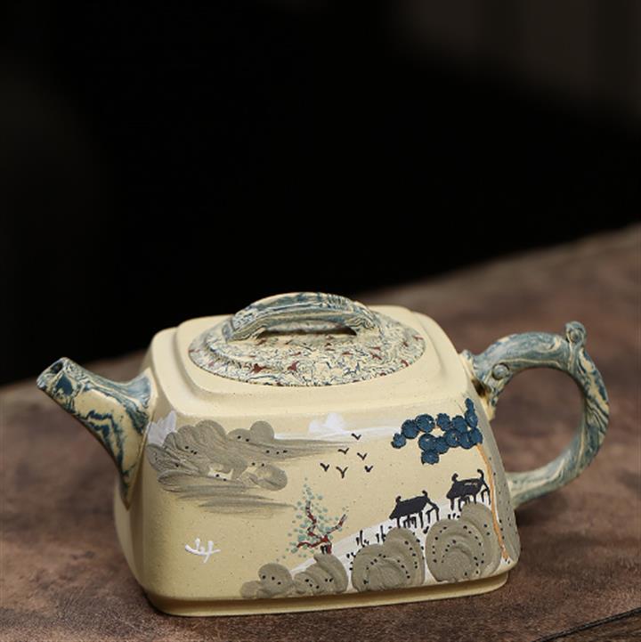 290cc原礦本山綠泥+絞泥山水四方松臺泡茶壺POT9872