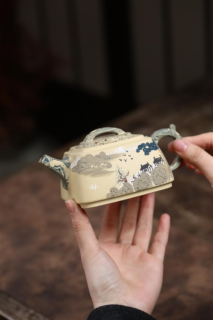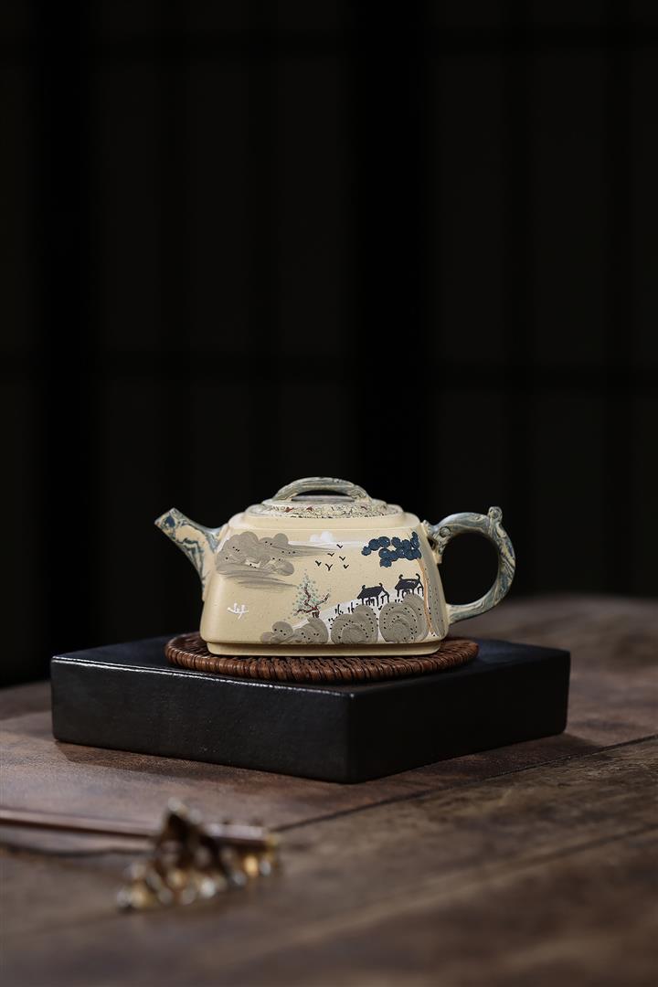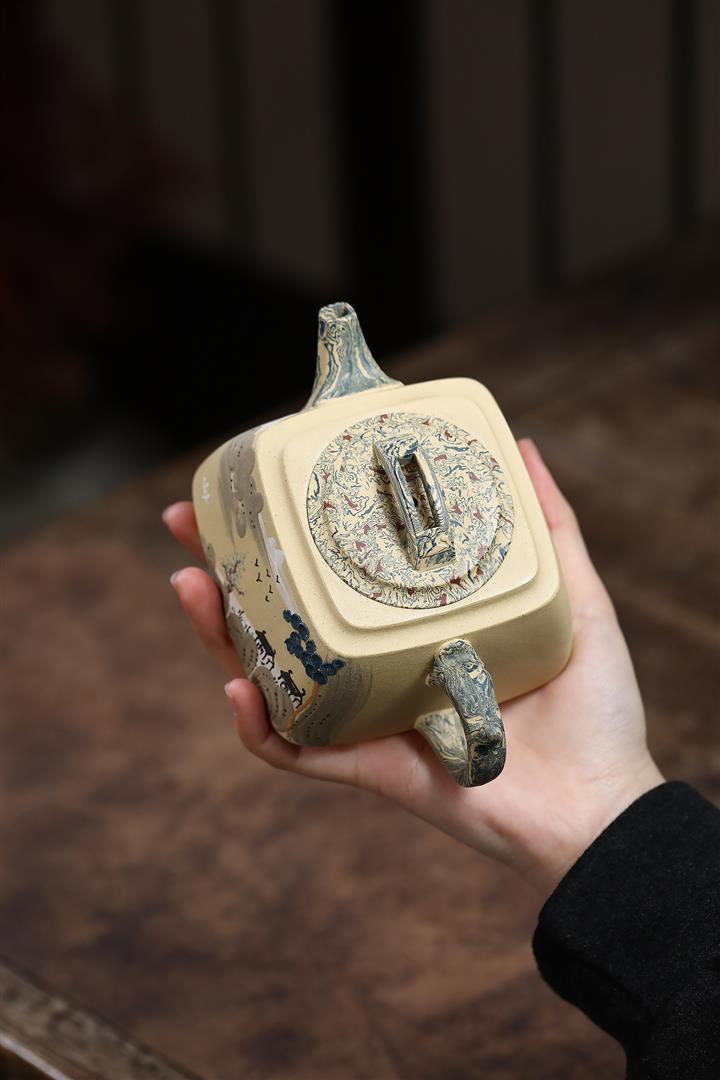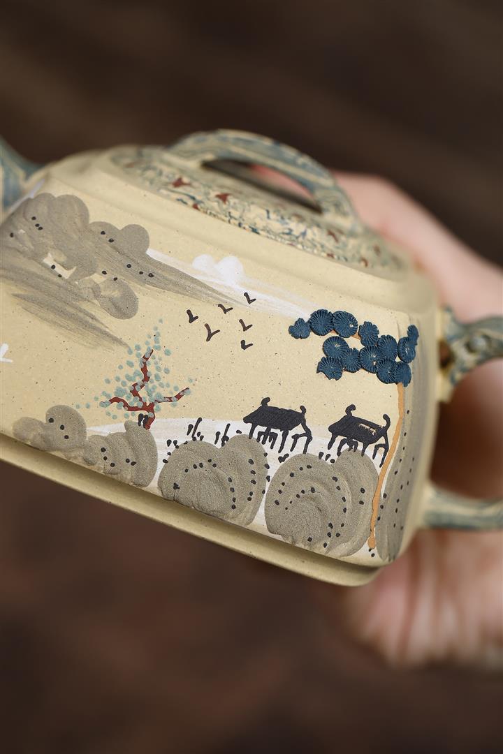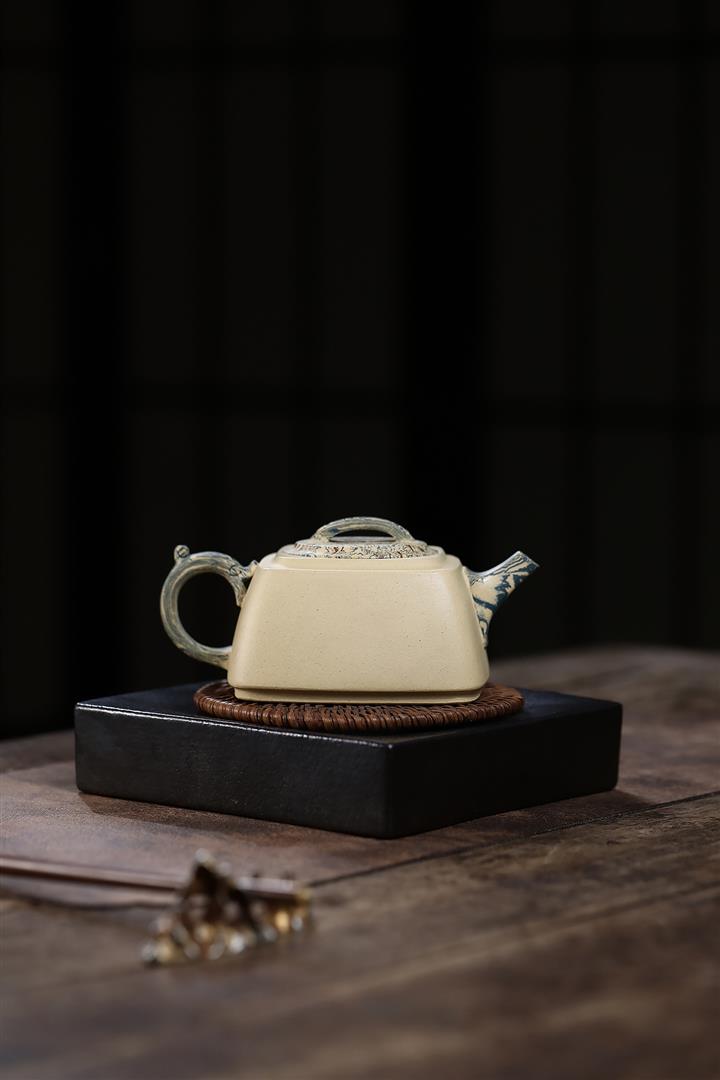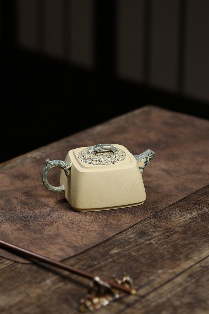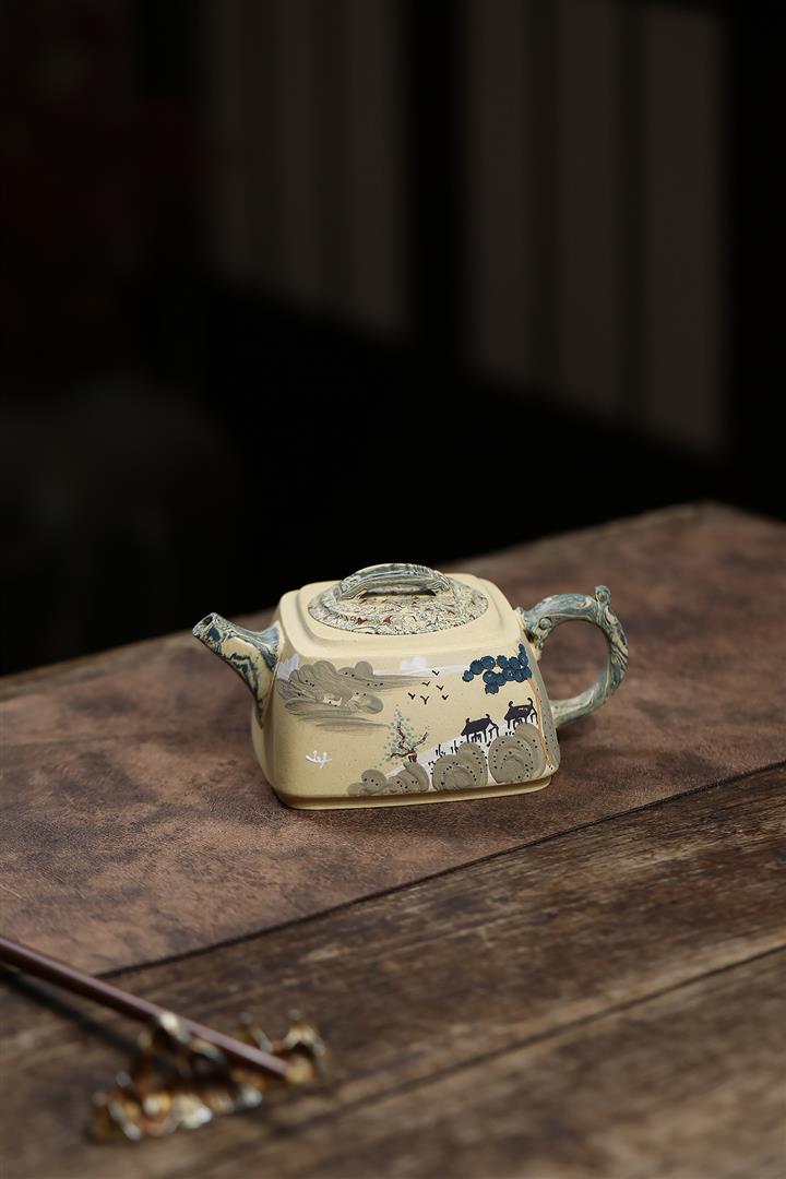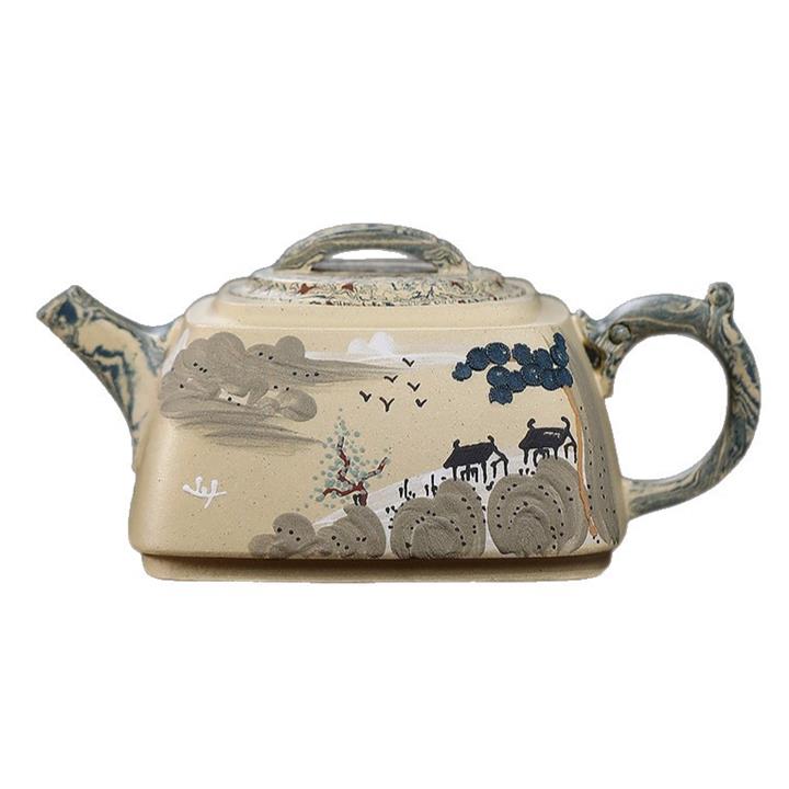 290cc原礦本山綠泥+絞泥山水四方松臺泡茶壺POT9872