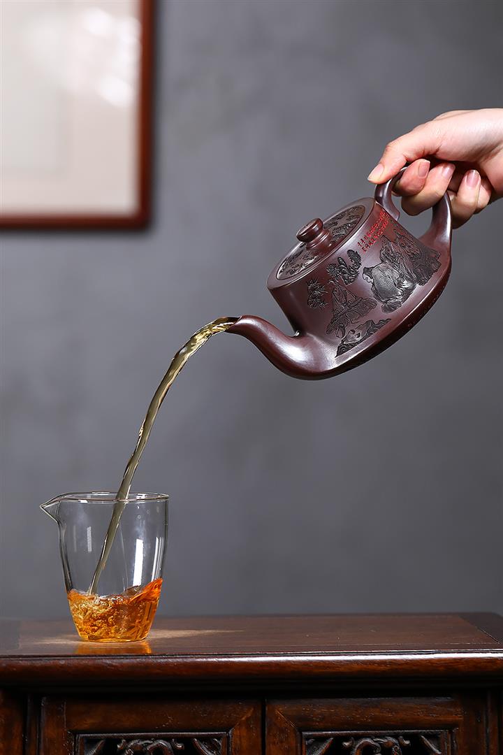 【泥料特點】砂土氣重,似淳實農民,日久使用,漸露鋒芒,養成變化,溫潤莊重。紫砂是壹種雙重氣孔結構的多孔性材質,氣孔微細,密度高。用紫砂壺沏茶,不失原味,且香不渙散,得茶之真香真味。紫砂使用越久,壺身色澤越發光亮照人,氣韻溫雅。紫砂壺長久使用器身會因撫摸擦拭,變得越發溫潤光澤。