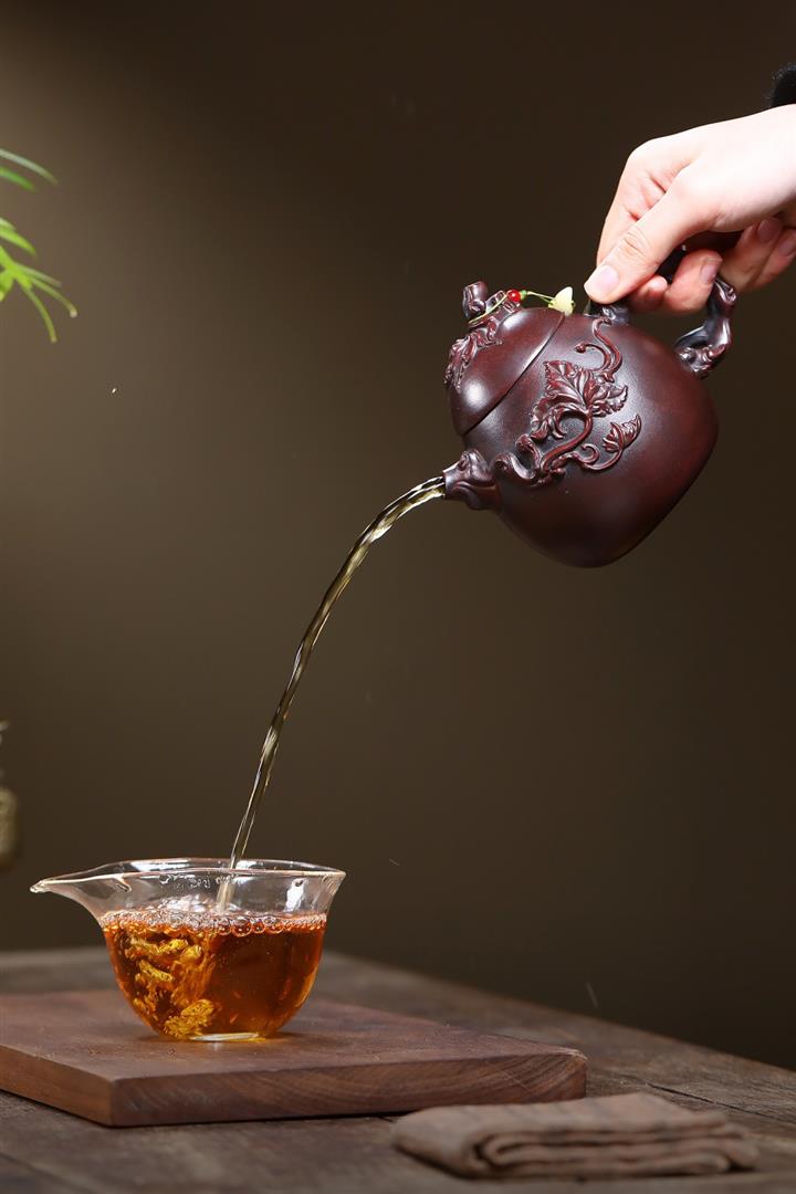 【泥料特點】砂土氣重,似淳實農民,日久使用,漸露鋒芒,養成變化,溫潤莊重。紫砂是壹種雙重氣孔結構的多孔性材質,氣孔微細,密度高。用紫砂壺沏茶,不失原味,且香不渙散,得茶之真香真味。紫砂使用越久,壺身色澤越發光亮照人,氣韻溫雅。紫砂壺長久使用器身會因撫摸擦拭,變得越發溫潤光澤。