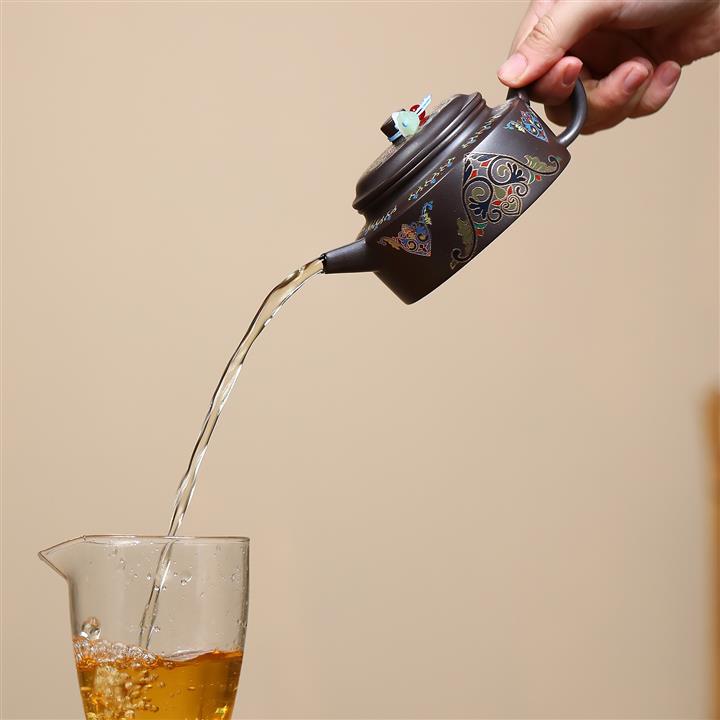 【泥料特點】砂土氣重,似淳實農民,日久使用,漸露鋒芒,養成變化,溫潤莊重。紫砂是壹種雙重氣孔結構的多孔性材質,氣孔微細,密度高。用紫砂壺沏茶,不失原味,且香不渙散,得茶之真香真味。紫砂使用越久,壺身色澤越發光亮照人,氣韻溫雅。紫砂壺長久使用器身會因撫摸擦拭,變得越發溫潤光澤。