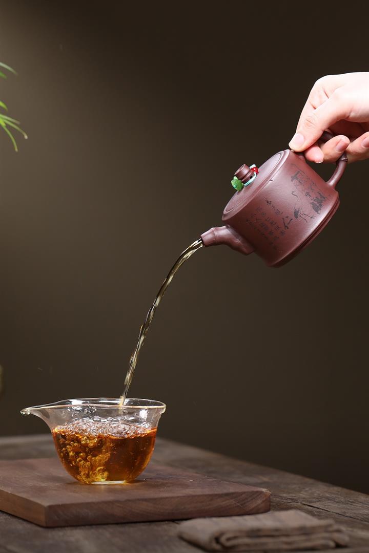 【泥料特點】砂土氣重,似淳實農民,日久使用,漸露鋒芒,養成變化,溫潤莊重。紫砂是壹種雙重氣孔結構的多孔性材質,氣孔微細,密度高。用紫砂壺沏茶,不失原味,且香不渙散,得茶之真香真味。紫砂使用越久,壺身色澤越發光亮照人,氣韻溫雅。紫砂壺長久使用器身會因撫摸擦拭,變得越發溫潤光澤。