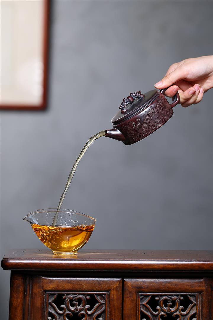【泥料特點】砂土氣重,似淳實農民,日久使用,漸露鋒芒,養成變化,溫潤莊重。紫砂是壹種雙重氣孔結構的多孔性材質,氣孔微細,密度高。用紫砂壺沏茶,不失原味,且香不渙散,得茶之真香真味。紫砂使用越久,壺身色澤越發光亮照人,氣韻溫雅。紫砂壺長久使用器身會因撫摸擦拭,變得越發溫潤光澤。