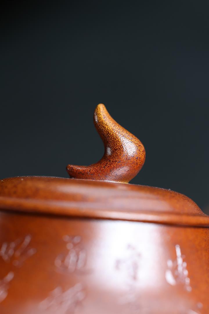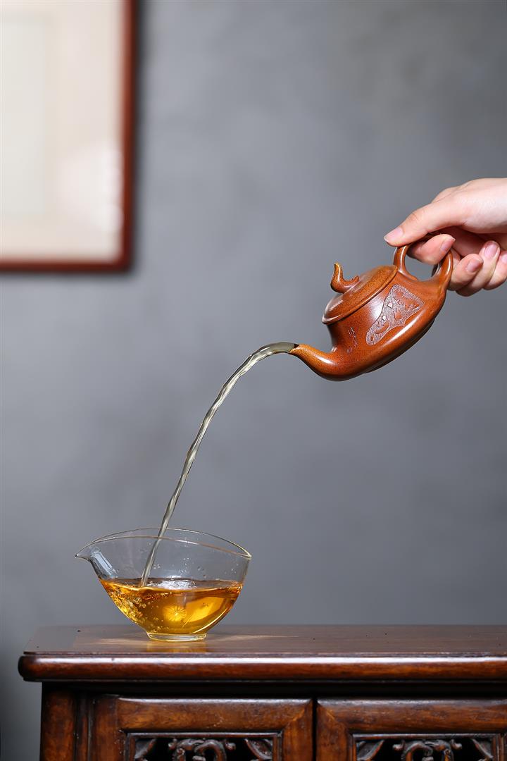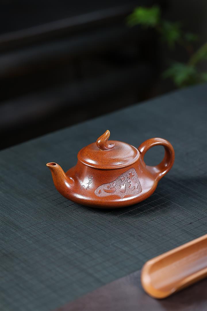 【泥料特點】砂土氣重,似淳實農民,日久使用,漸露鋒芒,養成變化,溫潤莊重。紫砂是壹種雙重氣孔結構的多孔性材質,氣孔微細,密度高。用紫砂壺沏茶,不失原味,且香不渙散,得茶之真香真味。紫砂使用越久,壺身色澤越發光亮照人,氣韻溫雅。紫砂壺長久使用器身會因撫摸擦拭,變得越發溫潤光澤。