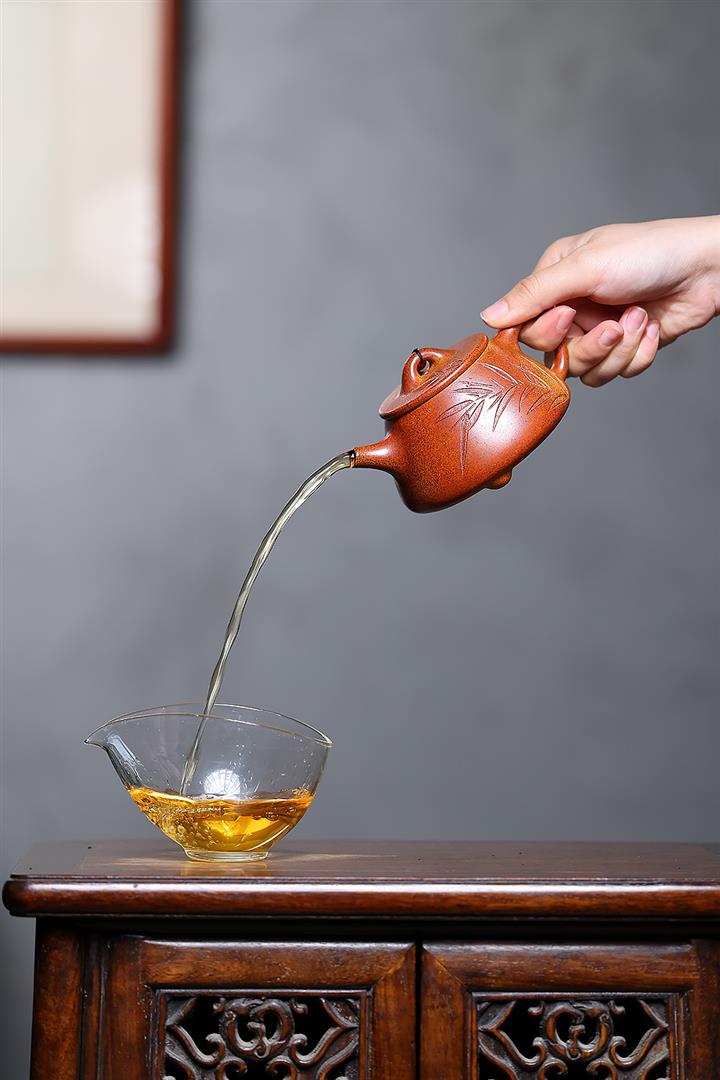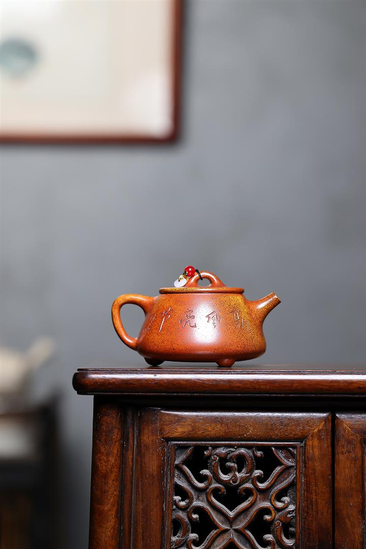 【泥料特點】砂土氣重,似淳實農民,日久使用,漸露鋒芒,養成變化,溫潤莊重。紫砂是壹種雙重氣孔結構的多孔性材質,氣孔微細,密度高。用紫砂壺沏茶,不失原味,且香不渙散,得茶之真香真味。紫砂使用越久,壺身色澤越發光亮照人,氣韻溫雅。紫砂壺長久使用器身會因撫摸擦拭,變得越發溫潤光澤。