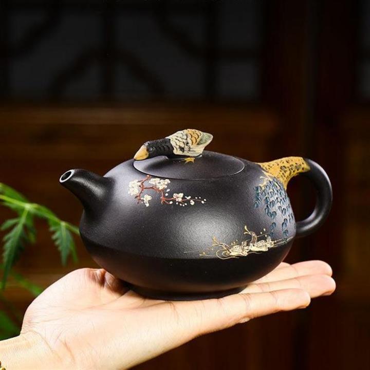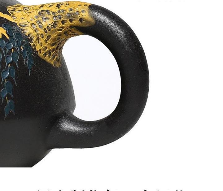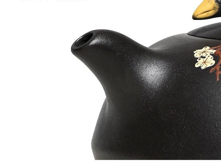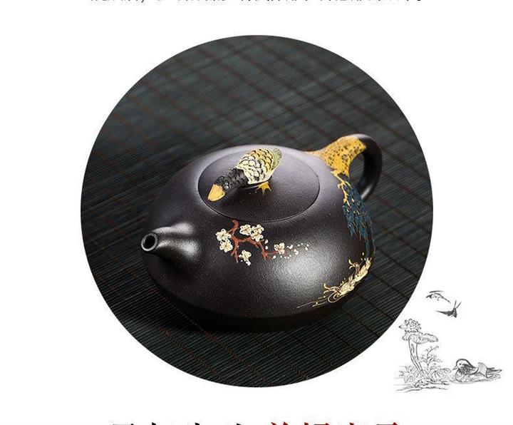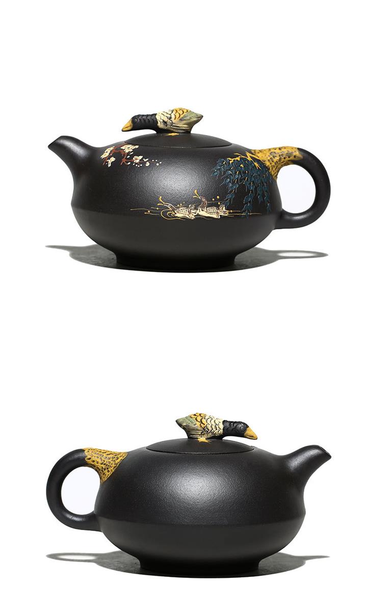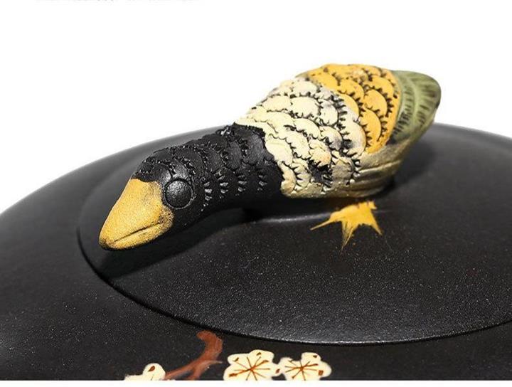 【介紹】此作品壺身手工泥繪鴛鴦戲水圖,細節紋理繪製細膩,形象逼真。壺鈕鴛鴦造型設計,雕刻生動,惟妙惟肖。原礦黑泥製作,其泥質非常細膩,流把張弛有度,比例恰到好處。
