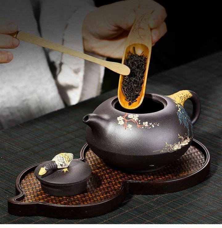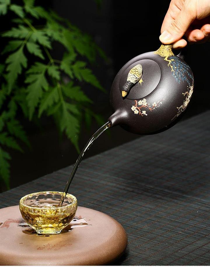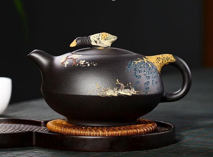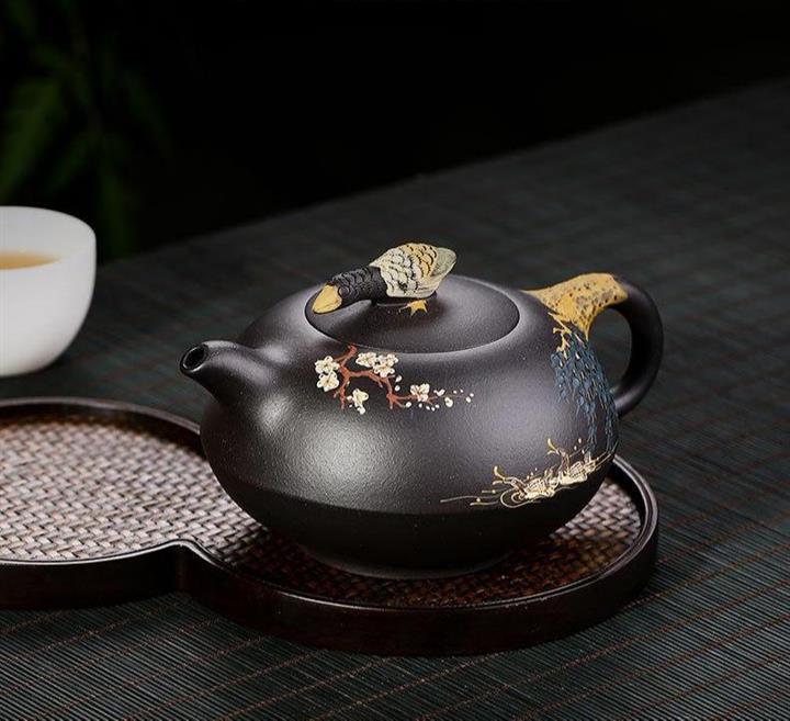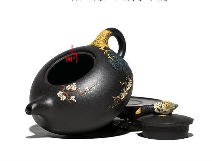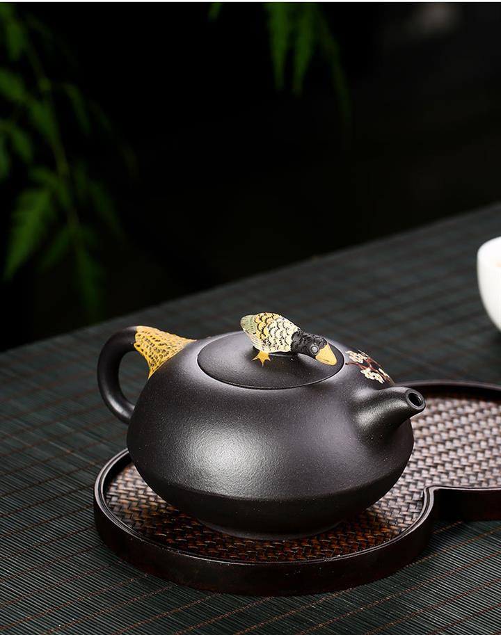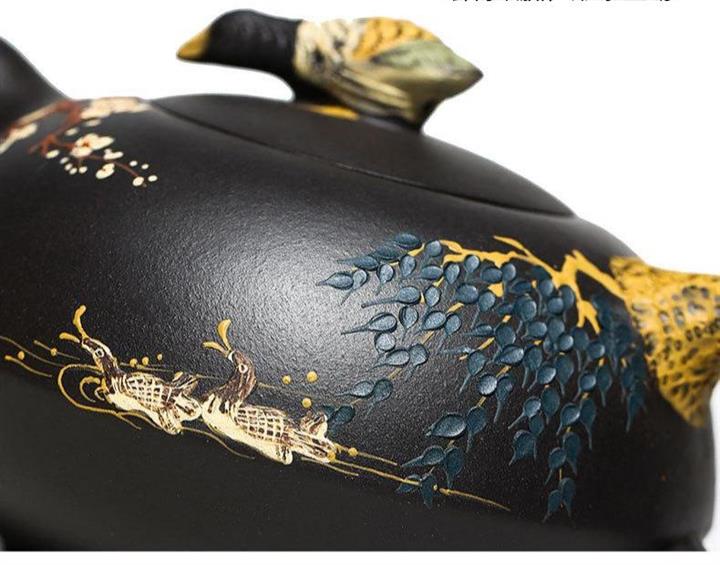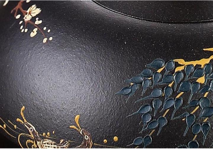 黑泥紫砂壺手工鴛鴦戲水泥繪茶壺370cc POT2689