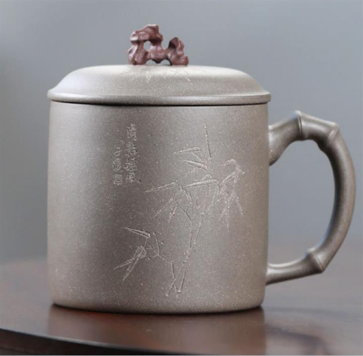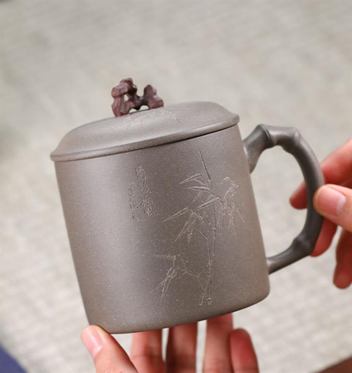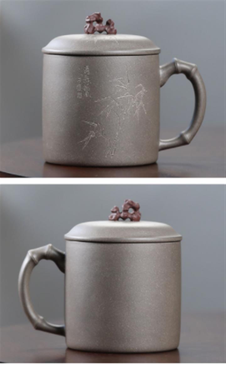 青段泥太湖石竹節杯大號功夫茶杯單杯純全手工刻繪紫砂杯帶蓋pot3811
