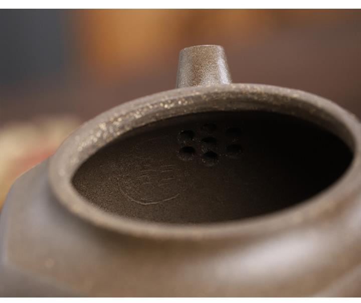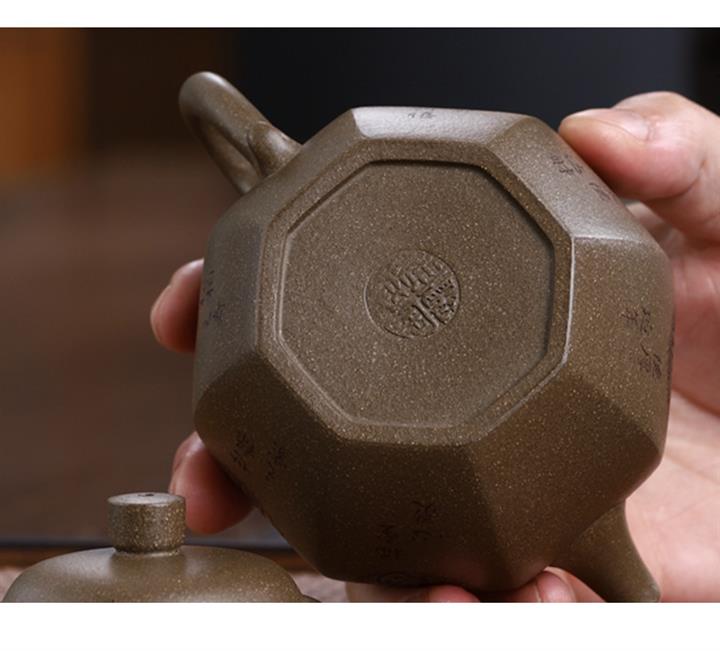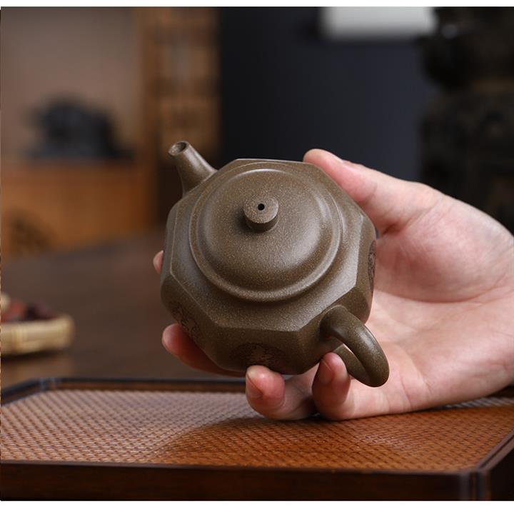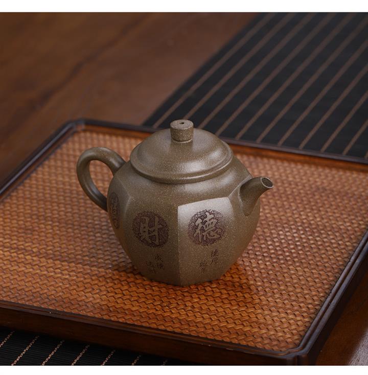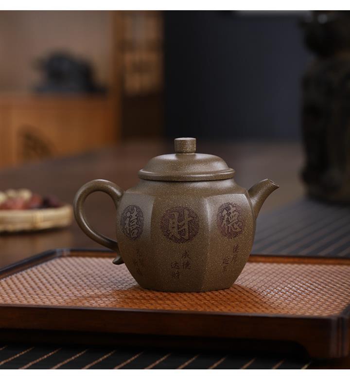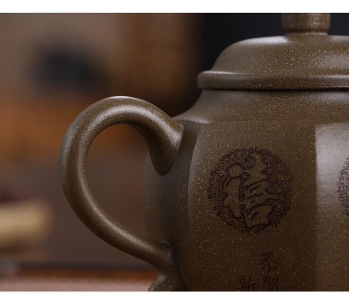 【簡述】整器穩重、渾厚有力,是一款不可多得的好壺;該款壺兼具了圓壺與八方的特色,骨肉勻亭,質感強烈。圓壺嘴、把與壺身搭配自然,方中見圓,方圓之間盡顯力道。整器手工雕刻德財喜福祿壽,寓意美好。製作精良,是一把性價比、非常實用的殺茶利器。