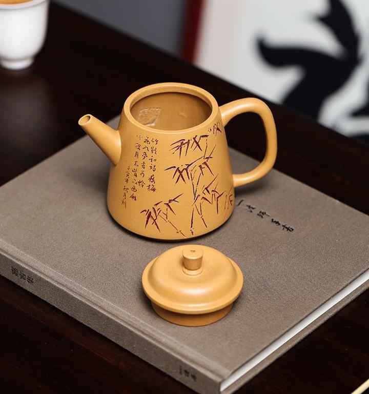 紫砂壺原礦段泥手工刻繪竹韻汲直茶壺功夫茶具pot3772