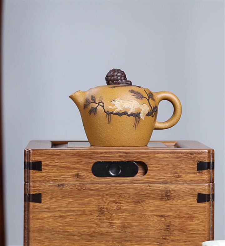 原礦黃段泥繪松果紫砂手工禮品茶壺茶具POT3972