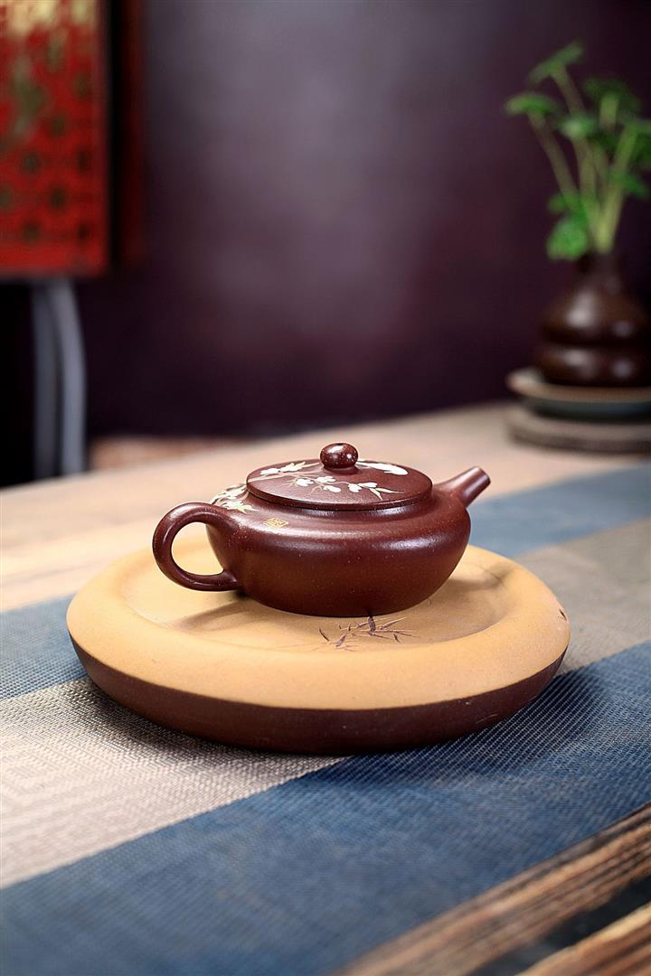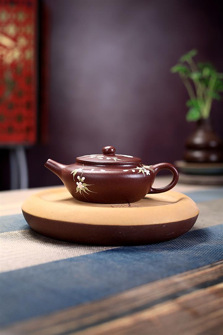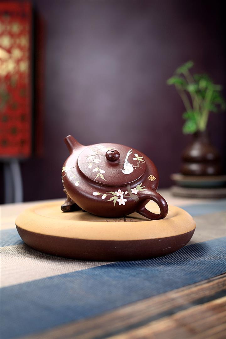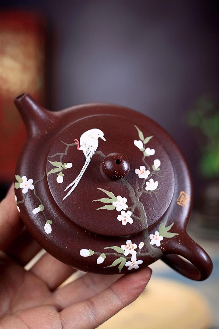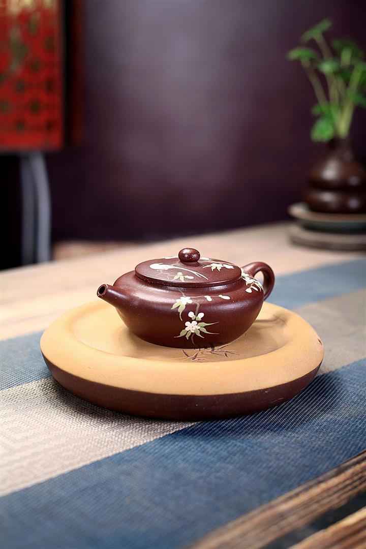 紫砂壺茶壺茶具原礦紫泥手工泥繪喜上眉梢扁晨POT3973