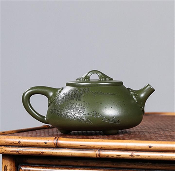 原礦綠泥山水如意石瓢手工刻繪POT3985